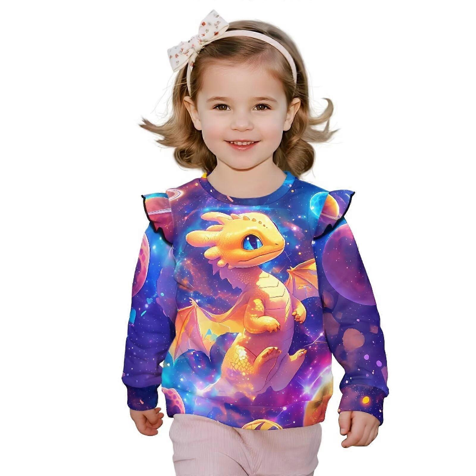 Cute Dinosaur Galaxy Planet Crewneck Sweatshirt for Toddler Girls, Soft Ruffle Shoulder, Long Sleeve Pullover, Size 1-2