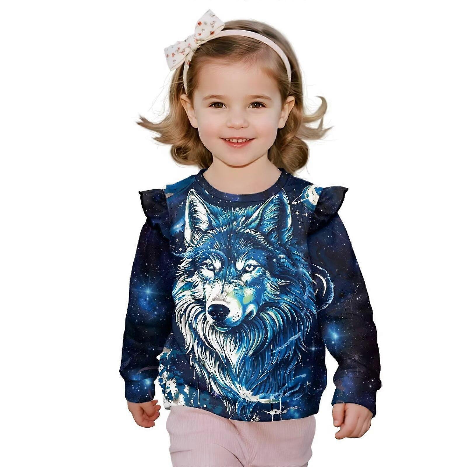 Toddler Girls Sweatshirt Soft Blue Galaxy Wolf Girl Ruffled Shoulder Long Sleeve Pullover Sweater Crewneck Shirts Tops Fall Fashion T-Shirts Size 1-2