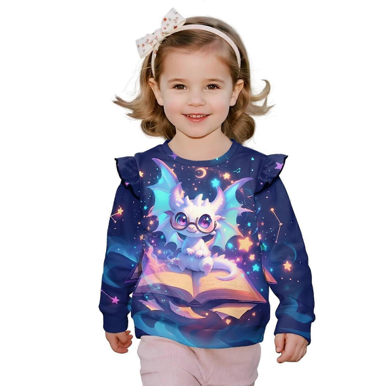 Toddler Girl Long Sleeve Ruffle Shoulder Sweatshirt, Curious Dragon Starry Pullover – Compatible with Kids Fall/Spring Clothing