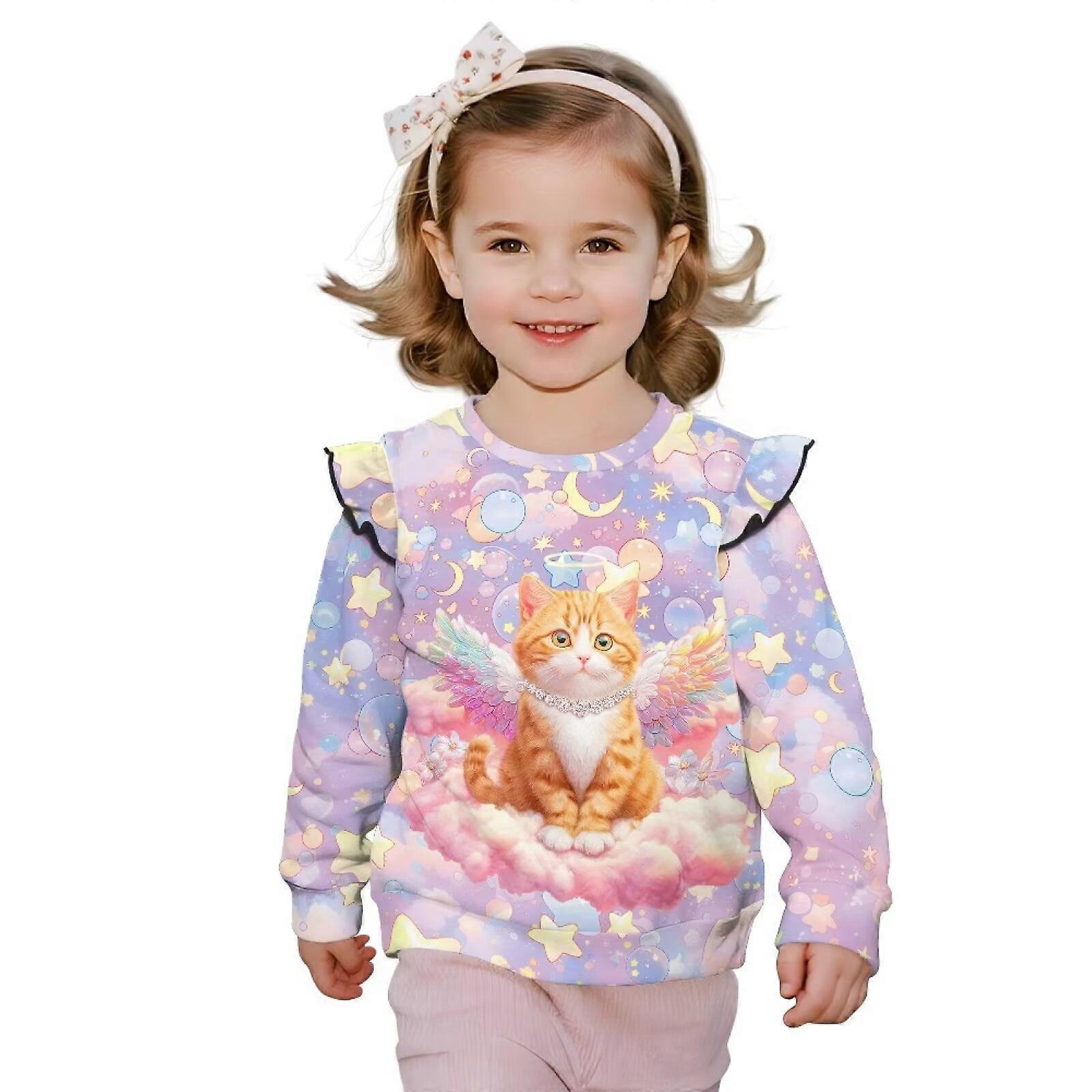 Girls Sweatshirts Cute Ruffle Shoulder Crewneck Sweatshirts Comfy Cute Paradise Cat Hoodie No Hood Sweatshirt, Soft and Lightweight Fall Clothing