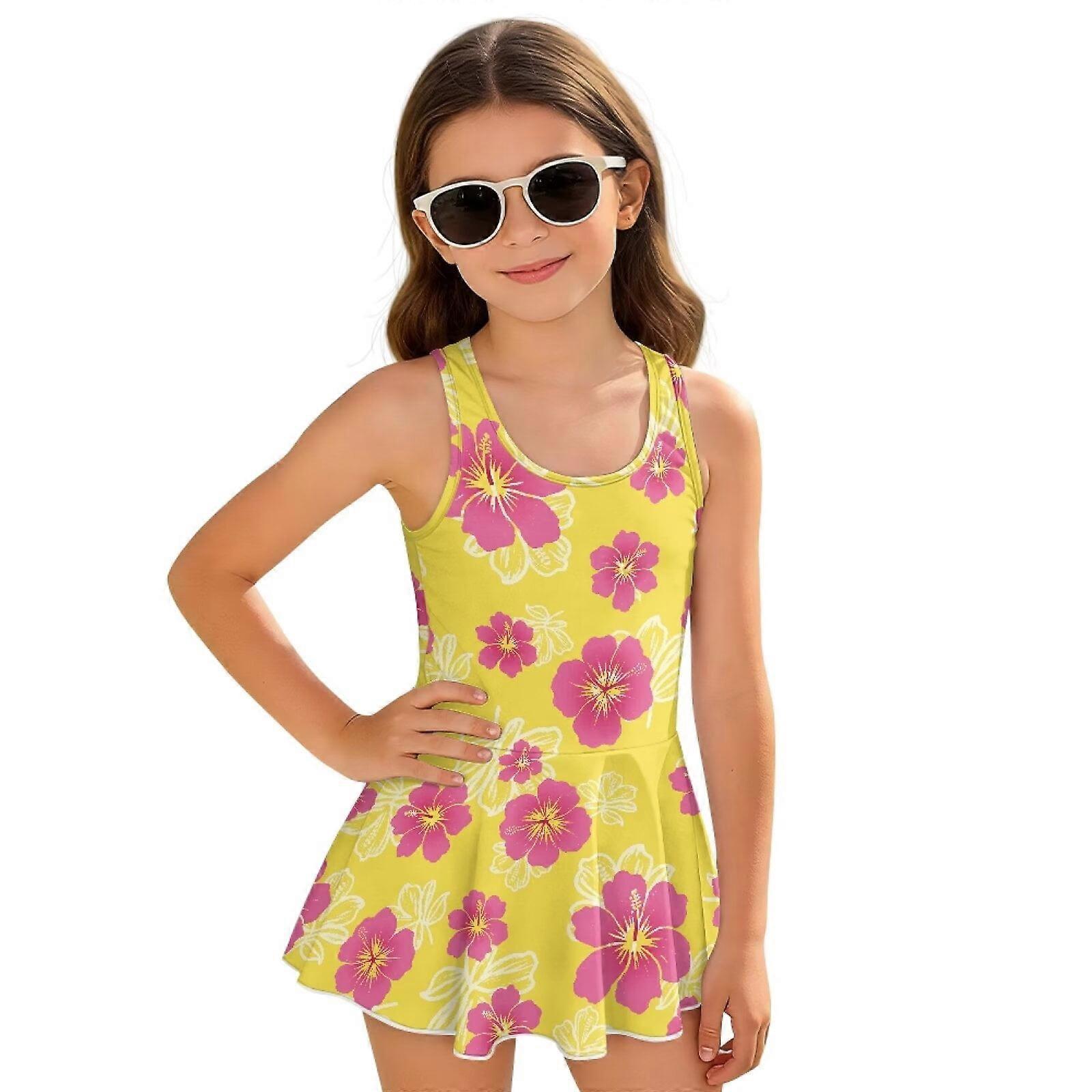 Girls Swimsuit One Piece Pink Hawaiian Floral Sleeveless Skirted Bathing Suit Size 12-13 Modest Beach Swimming Suit Beach Vacation