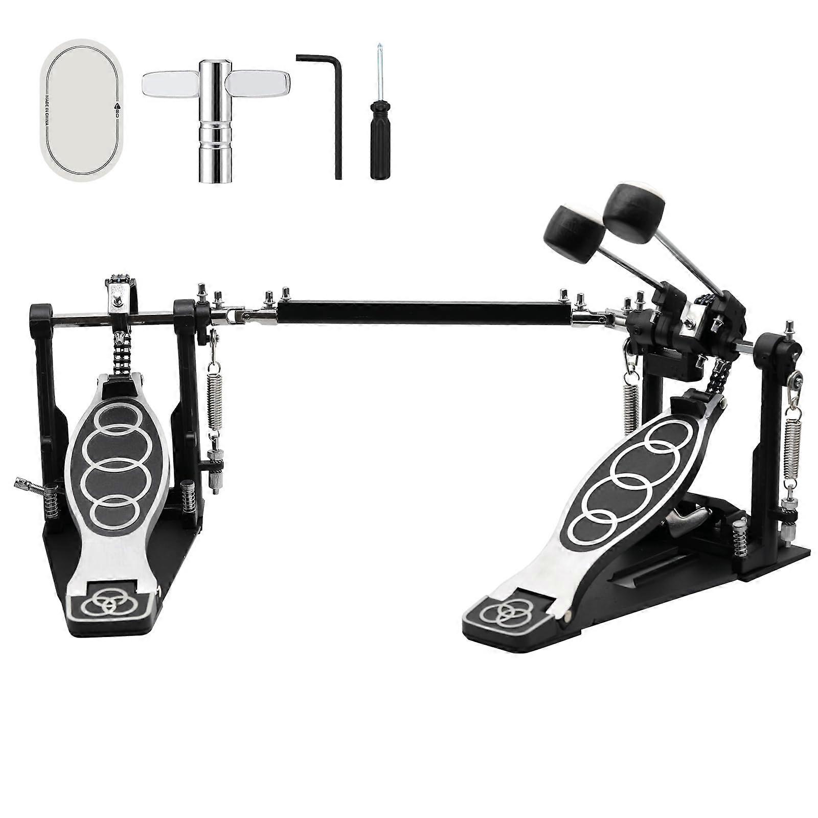 Double Bass Chain Drive Kick Pedal with Adjustable Beater Head, Drum Key, and Drum Patch Quick overview A reliable double bass pedal designed for acoustic and electronic drum kits. The double chain drive delivers consistent, responsive motion while the adjustable beater head and included drum key let you dial in feel and attack. A drum patch is included to protect drum heads and mesh pads during heavy use. Key benefits Improved control and speed: The double chain drive offers stable, direct power transfer for faster, more consistent double bass patterns. feel: Adjustable beater head height and angle let you tailor rebound and impact for different styles and playing preferences. Ready to use and adjustable: Includes a drum key for fast tension and height adjustments so you can set up quickly without extra tools. Protects drum surfaces: The supplied drum patch reduces wear on acoustic heads and electronic mesh pads, extending pad life and reducing unwanted noise. Durable construction: Designed for regular use in practice and performance, with metal components built to withstand repeated playing. Function and compatibility Function: Dual pedal system for coordinated right and left foot operation; chain drive mechanism for reliable transfer of motion; adjustable beater head for position and impact control. Compatibility: Designed to work with most standard acoustic bass drums and electronic drum modules and mesh pads. The drum patch is suitable for use on acoustic drum heads and electronic pads to prevent wear. Size and fit: Compact footprint compatible with typical drum set setups and pedal placements; adjustable parts accommodate common drum hoop and pad configurations. Materials and performance Construction: Sturdy metal components where strength and durability are required, combined with adjustable hardware for fine tuning. Performance: Smooth, consistent response ideal for genres requiring rapid footwork and dynamic control. Setup options let you balance speed and power based on playing style. Included items Double chain drive bass pedal assembly Adjustable beater head Drum key for adjustments Drum patch for head and pad protection Practical use scenarios 1) Live band performance: Use the double pedal for accurate, speed double bass patterns in rock, metal, or fusion sets. Adjust the beater position between songs to match different songs levels of attack and sustain. 2) Electronic practice sessions: Fit the pedal to an electronic drum kit and place the drum patch on your mesh pad to cut down on wear and reduce pad noise while keeping a natural feel. 3) Studio recording: Set precise beater angle and tension with the included drum key to achieve consistent strokes and cleaner takes during tight recording sessions. Why choose this pedal This double bass pedal balances durability, adjustability, and straightforward setup. It provides the control needed for both practice and performance while protecting drum surfaces and fitting into common drum kit configurations.