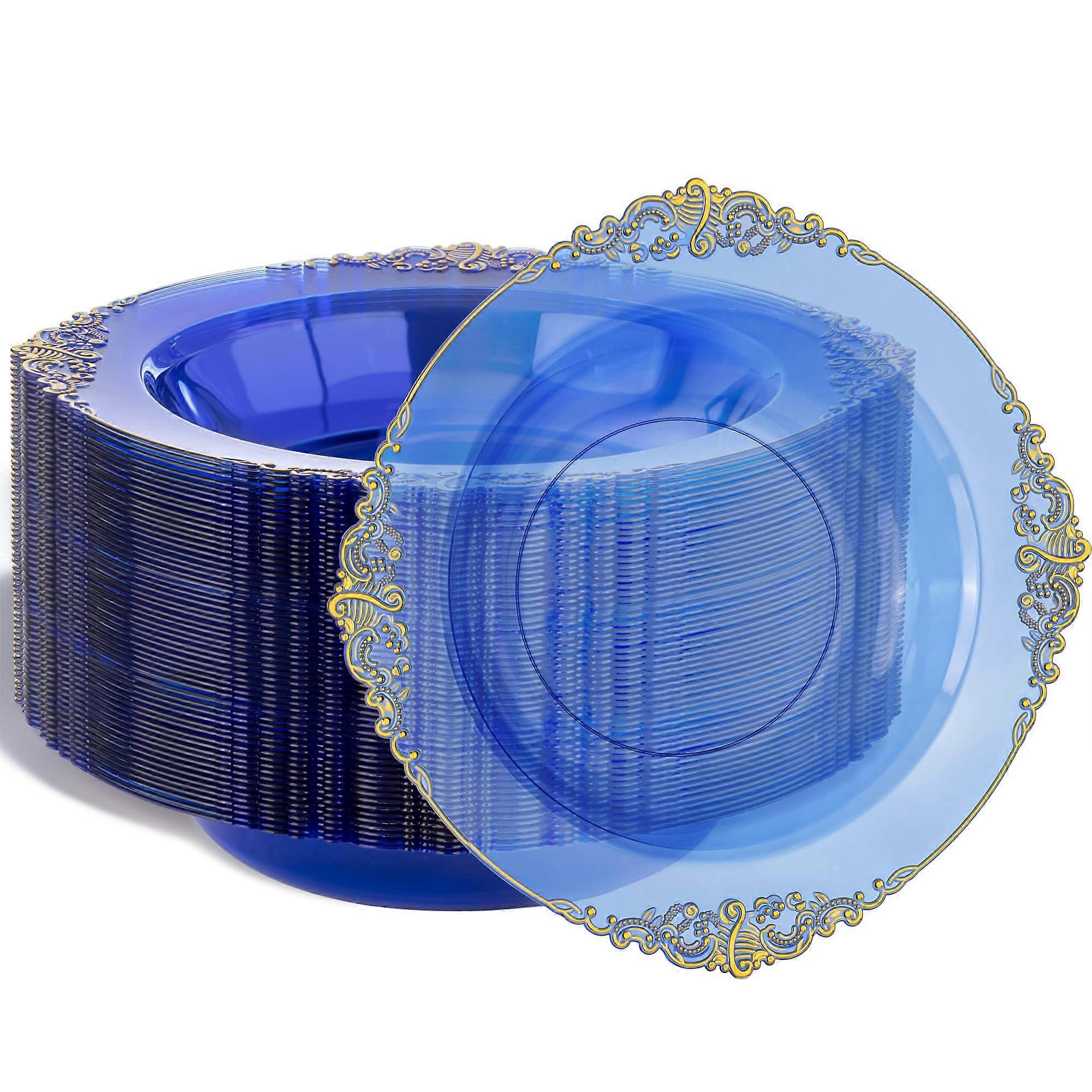 Disposable Plastic Bowls 12oz Clear Blue and Gold Rim Heavy Duty Salad Soup Bowls for Wedding Party 50PCS