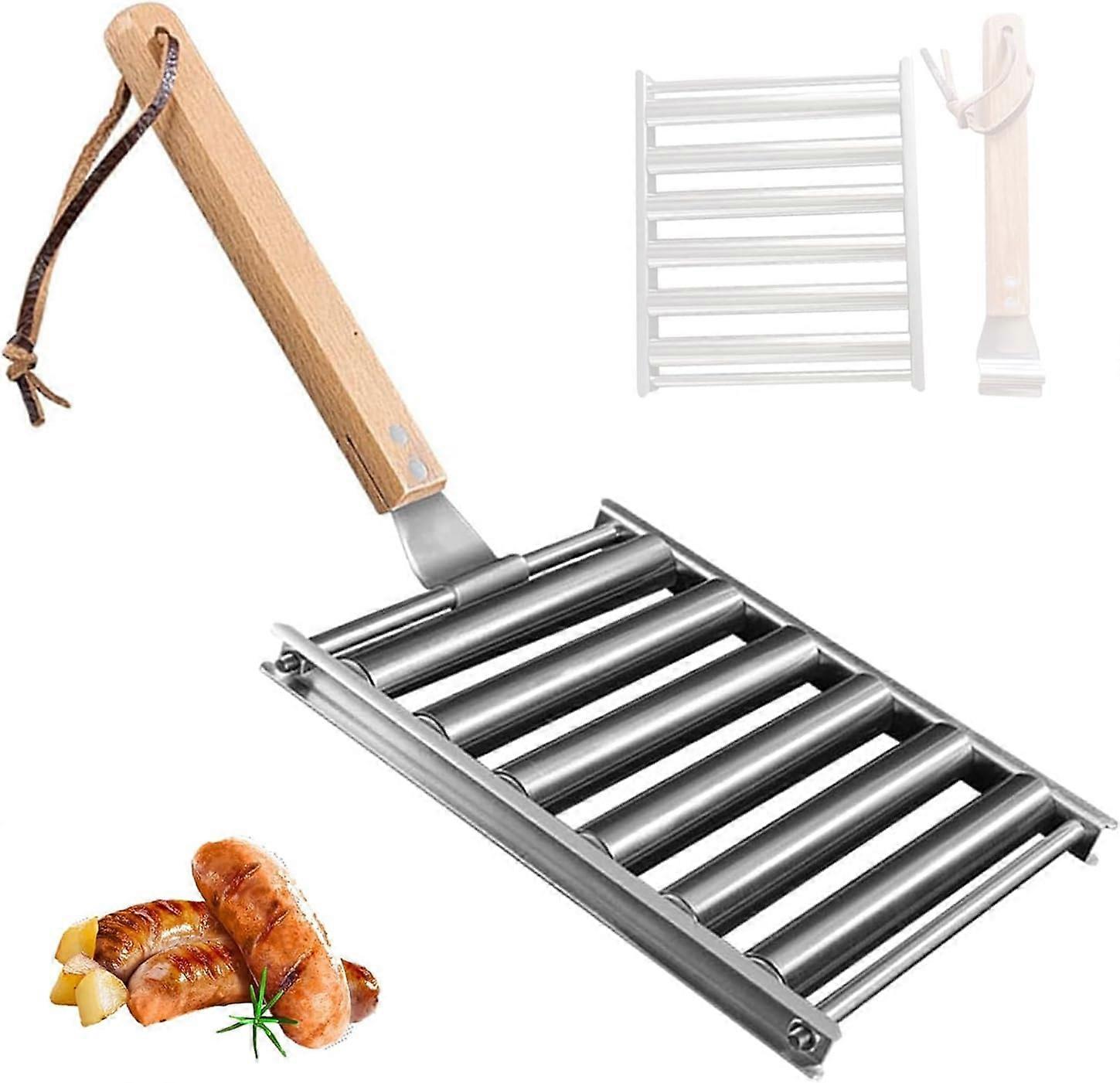 Hot Dog Roller Grill with Long Wooden Handle, 5 Slot Stainless Steel Sausage Roller for BBQ Camping