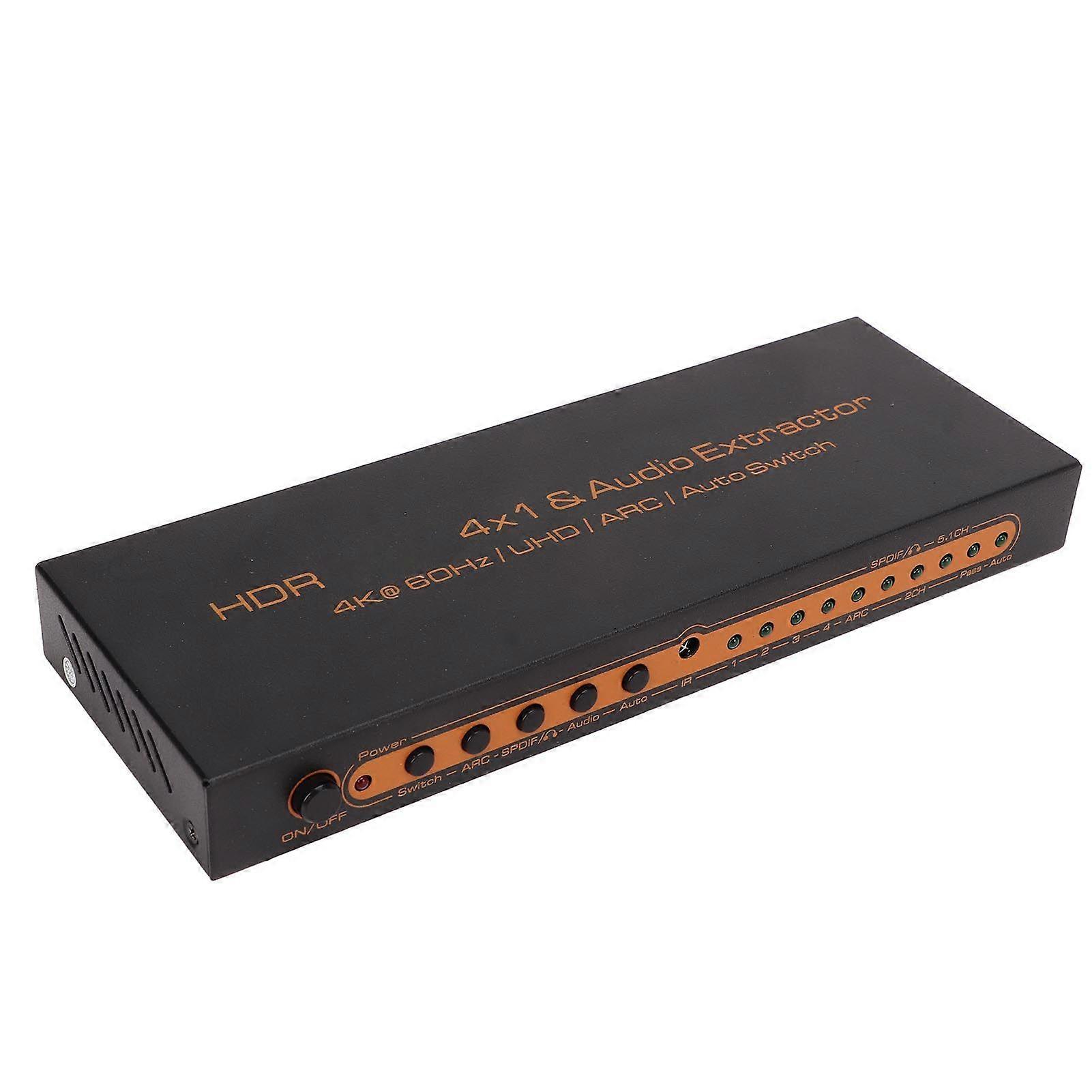 1、4 in 1 Switcher: Four inputs and one output. Independent audio design, HD multimedia interface, digital optical fiber, 3.5 headphone audio interface, enjoy the shocking effect of home theater. 2、HD Visual Experience: Manually and remotely switch four input devices, and switch to one display output at will. 4K at 60HZ 3D HDCP2.2 HDR ultra high visual experience. 3、Efficient Signal Transmission: No snowflakes and no freezes on the screen. High performance IP core is used to ensure efficient signal transmission. Eliminate the distortion and trailing of picture. 4、Wide Compatibility: Compatible with many devices, input device like computer, set top box, for PS3, for PS4, for Xbox, output device is monitor, TV, projector, amplifier and audio. 5、Durable: External heat dissipation design, all metal shell frosted surface, ventilation and heat dissipation, durable. Terminal gold plated process, anti interference, anti plugging, corrosion resistant, stable transmission.Item Type: HD Multimedia Interface SwitcherMaterial: MetalGross Weight: 568g / 20.0ozProduct Size: 205x74x26mm / 8.1x2.9x1.0inInput Channel: 4pcs HD Multimedia InterfaceOutput Channel: 2pcs HD Multimedia Interface, optical interface, 3.5 headphone interfaceARC Function: Support light, 3.5 headphone outputFile Formats: HDR, UHD, HLG, for Dolby VisionResolution Format: 480P, 720P, 1080P, 4K at 30Hz, 4K at 60HzColor Depth: 8 10 12Bit at 480P 720P 1080P, 8Bit at 2160PDigital Audio Output Format: LPCM2.0 DTS for DOLBY AC3...HD Multimedia Interface Input Cable Length: 2160P/AWG 26≤5m, 1080P/AWG 26≤10mHD Multimedia Interface Output Cable Length: 2160P/AWG 26≤5m 1080P/AWG 26≤10mDAC Sampling Frequency: 32-192 KHzDAC Bit Rate: 16-24 BitHD Multimedia Interface Transmission Bandwidth: 25-600MHzHD Multimedia Interface Transmission Rate: 0.75-18GbpsRemote Control Battery Information: 1pc Button battery CR2025 170mAhMaximum Operating Current: 600mAWorking Temperature: 0 - +40℃Operating Humidity Range: 5 to 85%RH (No Condensation)Storage Temperature: -15 to 55℃Storage Humidity range: 5 -95%RH(No Condensation) Item Type: HD Multimedia Interface SwitcherMaterial: MetalGross Weight: 568g / 20.0ozProduct Size: 205x74x26mm / 8.1x2.9x1.0inInput Channel: 4pcs HD Multimedia InterfaceOutput Channel: 2pcs HD Multimedia Interface, optical interface, 3.5 headphone interfaceARC Function: Support light, 3.5 headphone outputFile Formats: HDR, UHD, HLG, for Dolby VisionResolution Format: 480P, 720P, 1080P, 4K at 30Hz, 4K at 60HzColor Depth: 8 10 12Bit at 480P 720P 1080P, 8Bit at 2160PDigital Audio Output Format: LPCM2.0 DTS for DOLBY AC3...HD Multimedia Interface Input Cable Length: 2160P/AWG 26≤5m, 1080P/AWG 26≤10mHD Multimedia Interface Output Cable Length: 2160P/AWG 26≤5m 1080P/AWG 26≤10mDAC Sampling Frequency: 32-192 KHzDAC Bit Rate: 16-24 BitHD Multimedia Interface Transmission Bandwidth: 25-600MHzHD Multimedia Interface Transmission Rate: 0.75-18GbpsRemote Control Battery Information: 1pc Button battery CR2025 170mAhMaximum Operating Current: 600mAWorking Temperature: 0 - +40℃Operating Humidity Range: 5 to 85%RH (No Condensation)Storage Temperature: -15 to 55℃Storage Humidity range: 5 -95%RH(No Condensation) 1 x Host1 x Remote Control1 x Power Adapter1 x Manual