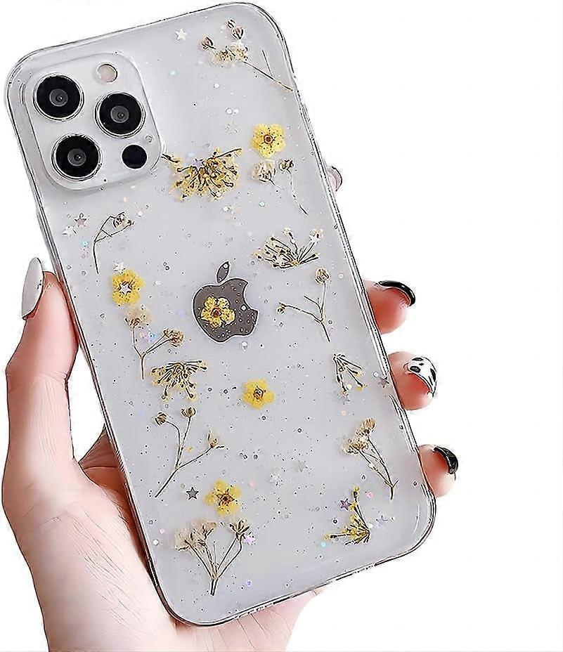 Cute Glitter Silicone iPhone Case with Pressed Real Flowers – Soft, Shockproof, Yellow (compatible with iPhone 12 Pro Max)