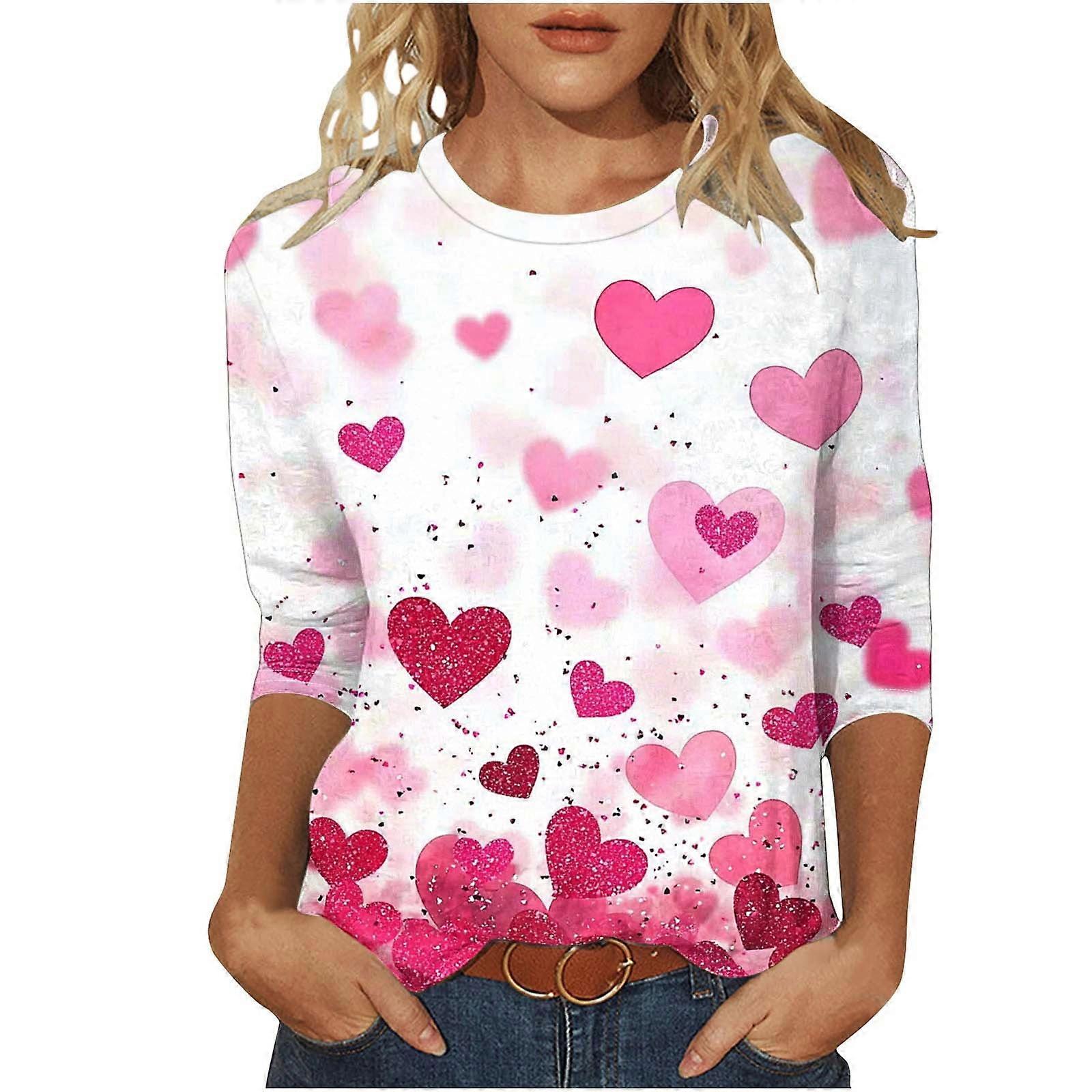 New Arrivals Fashion Tops Womens Valentine's Day Shirts 3/4 Sleeves Blouse Round Neck Heart Printed Casual Top,Size S-3XL