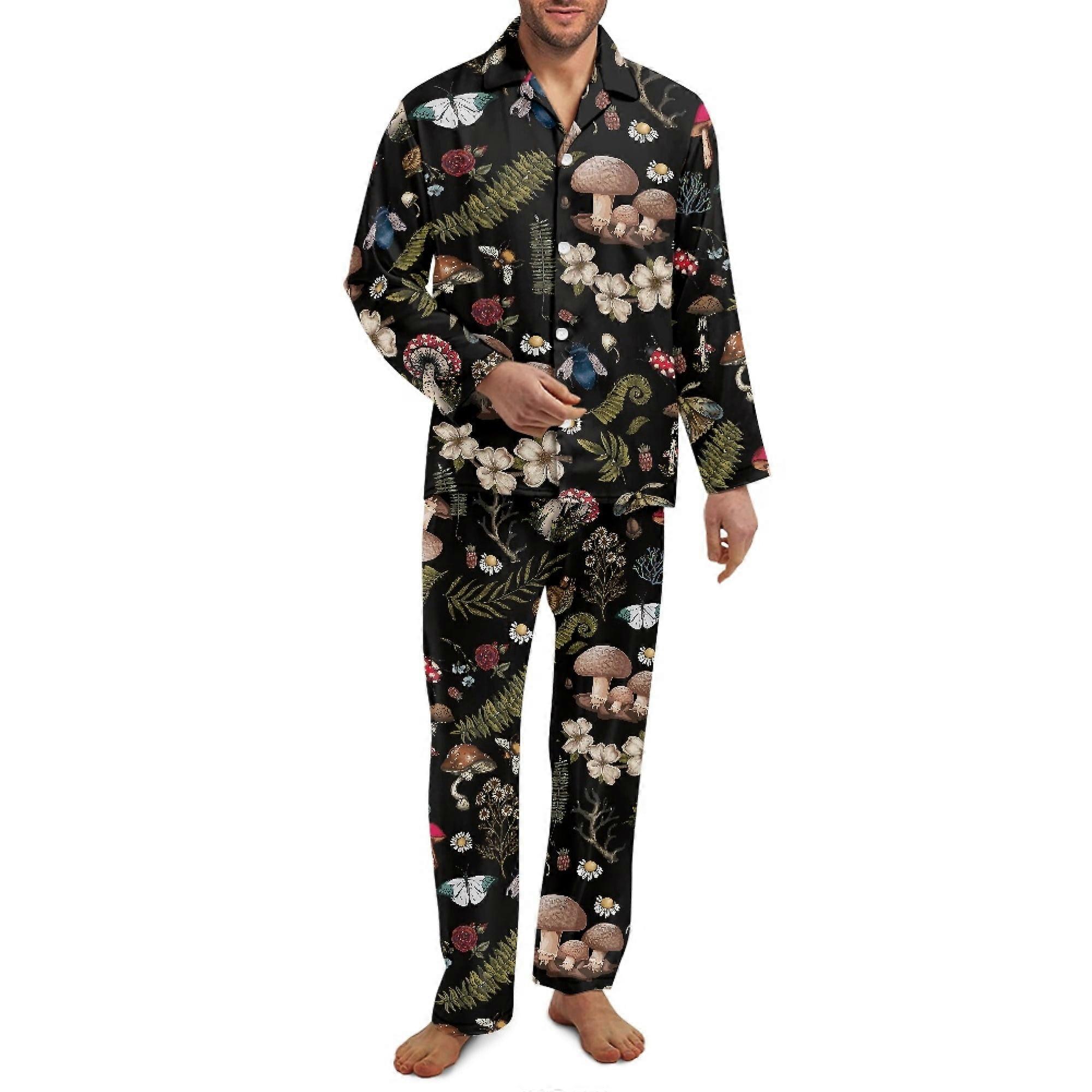 Muhsroom Plants Men's XL Long Sleeve Pajama Set with Pockets, Button-Up Tops & Pants, Aesthetic Sleepwear Set of 2