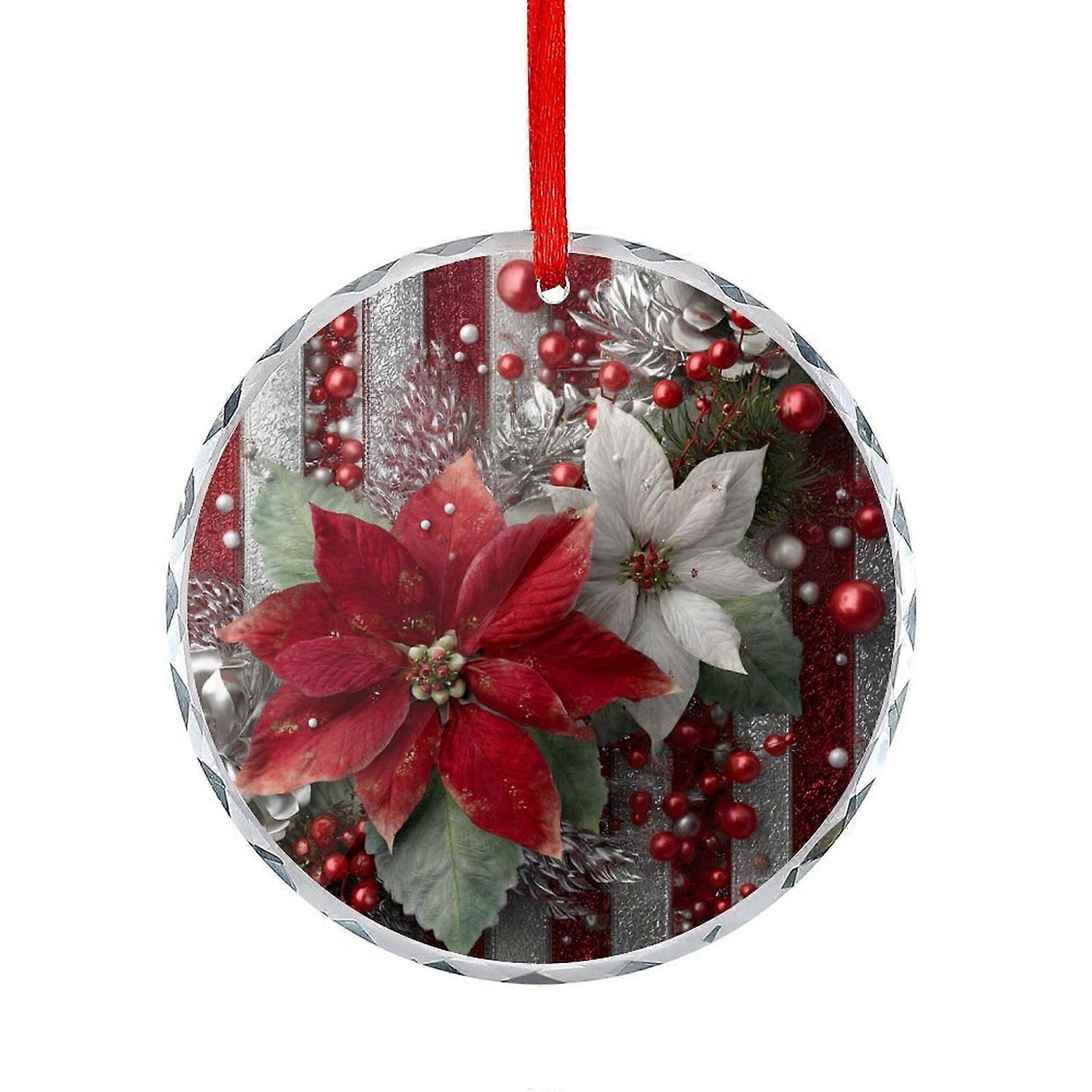 Vibrant Red Poinsettia, Pine, Holly & Berries Crystal Glass Christmas Ornament – Red & White Floral Tree Decor