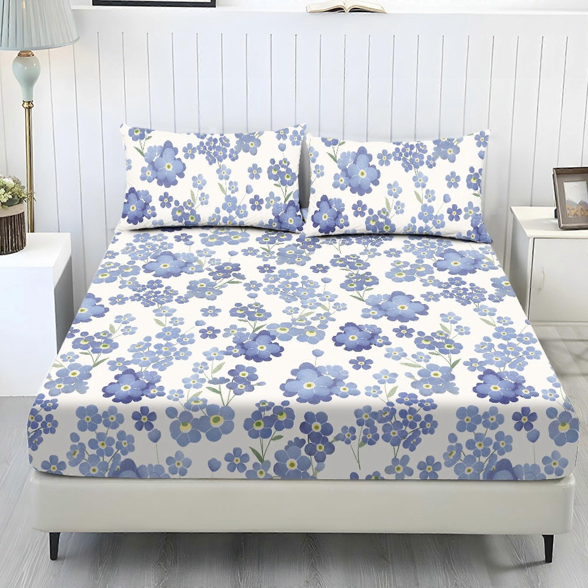Queen Size Bedding Set, 3 Piece Sheet Set with 1 Fitted Sheet and 2 Pillowcases Machine Washable Bedroom Decoration, Blue Flower White