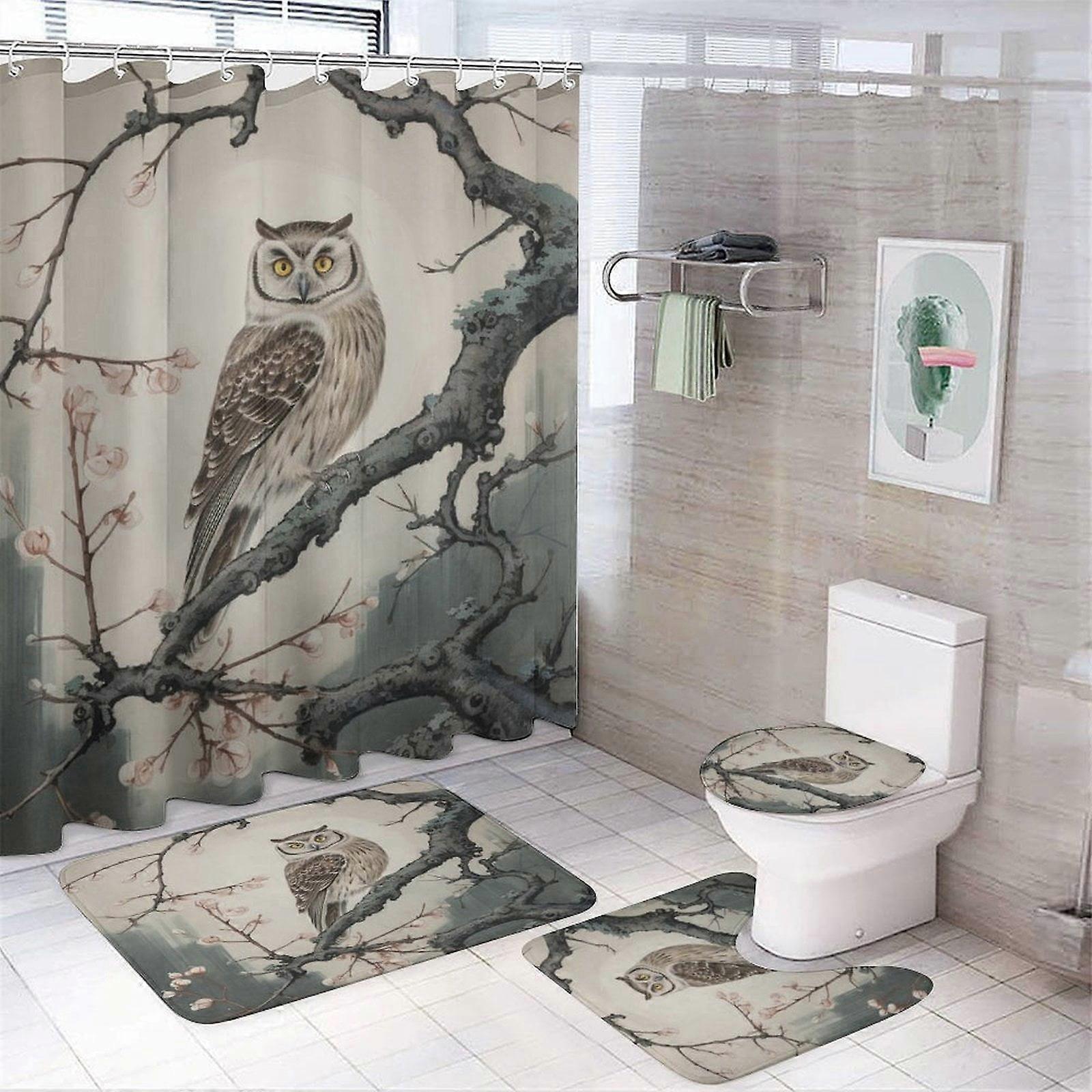4-Piece Owl Shower Curtain Set with Non-Slip Rugs, Toilet Mat & 12 Hooks – 72"x72", Cute Bathroom Decor