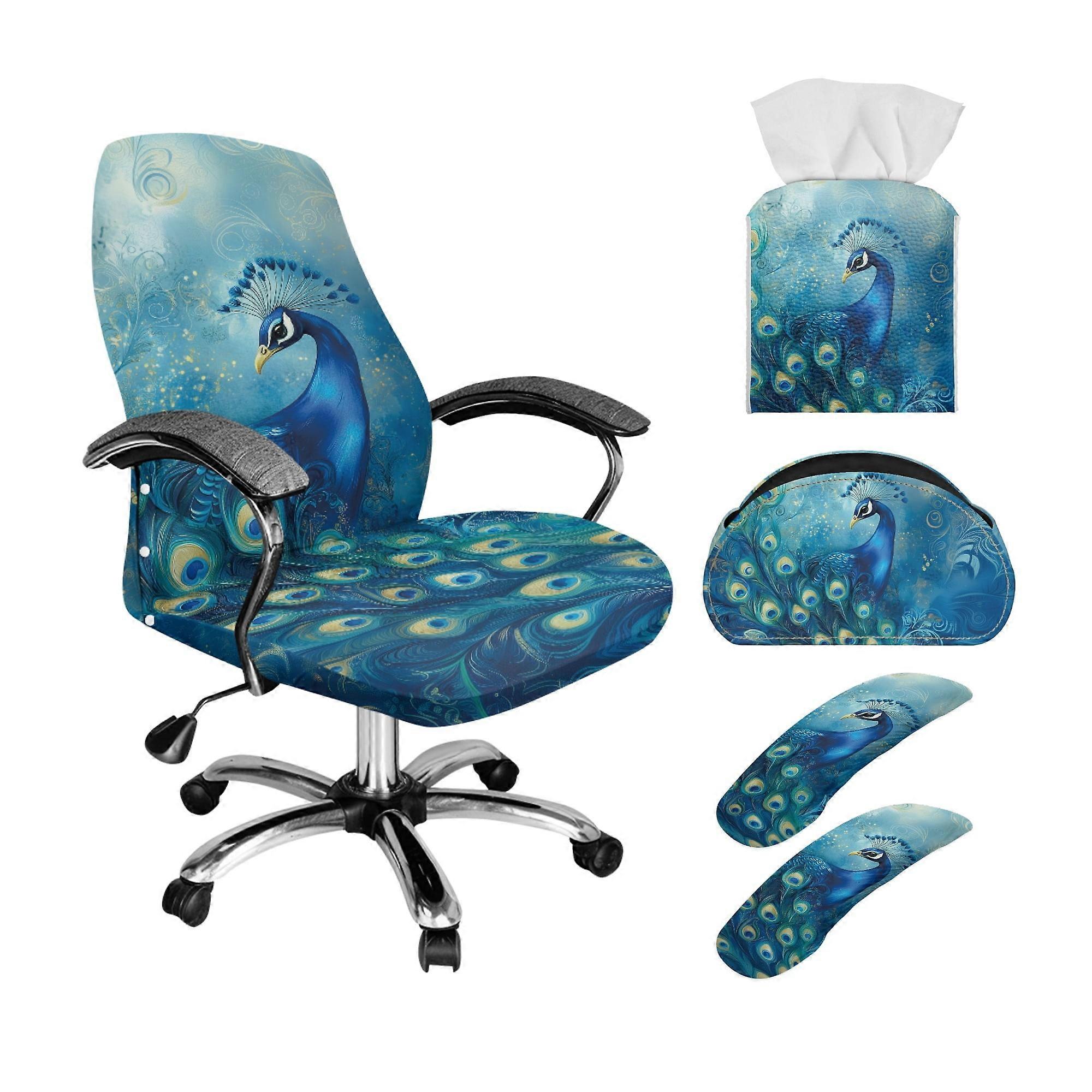 Peacock Print Office Chair Cover Set with Stretchable Slipcover, Armrest Protectors, 5-Compartment Remote Holder & Foldable Tissue Box Cover, L