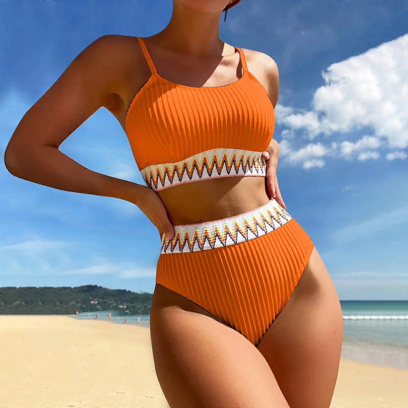 Women's High Waist Bikini Set, V-Neck Top & Color Block Design, Retro Flattering Two-Piece Swimsuit with Tummy Control – Saffron L