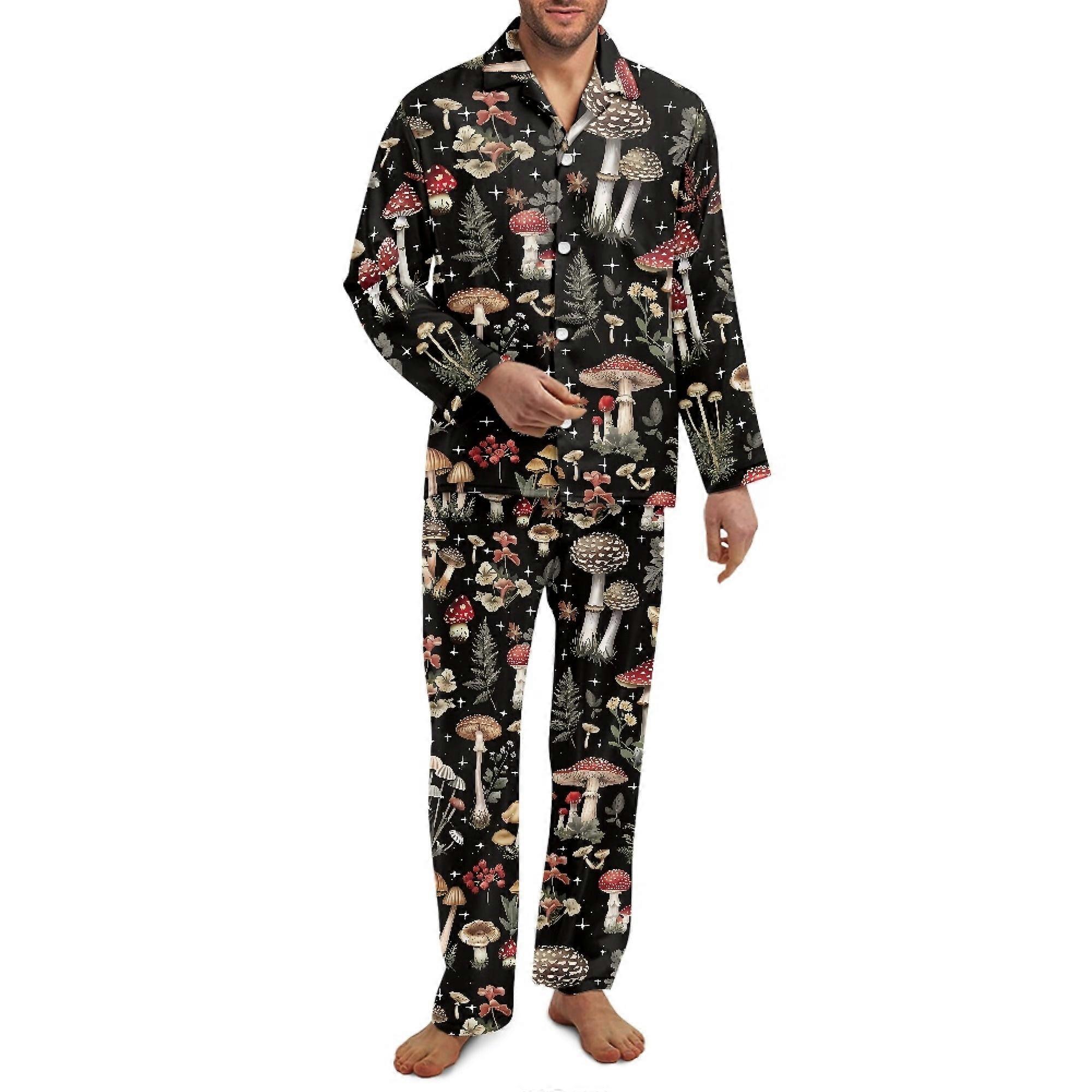 Mushroom Forest Long Sleeve 2-Piece Button-Up PJs for Men – XS to Plus Size Loungewear Set, Compatible with All Sizes