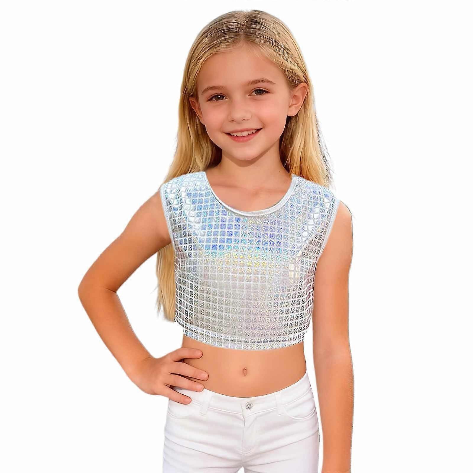 AWZXDE Girls Square Glitter Print Crop Top Sleeveless Tank For Party Performance Casual Wear And Kids Tops Apparel White,180