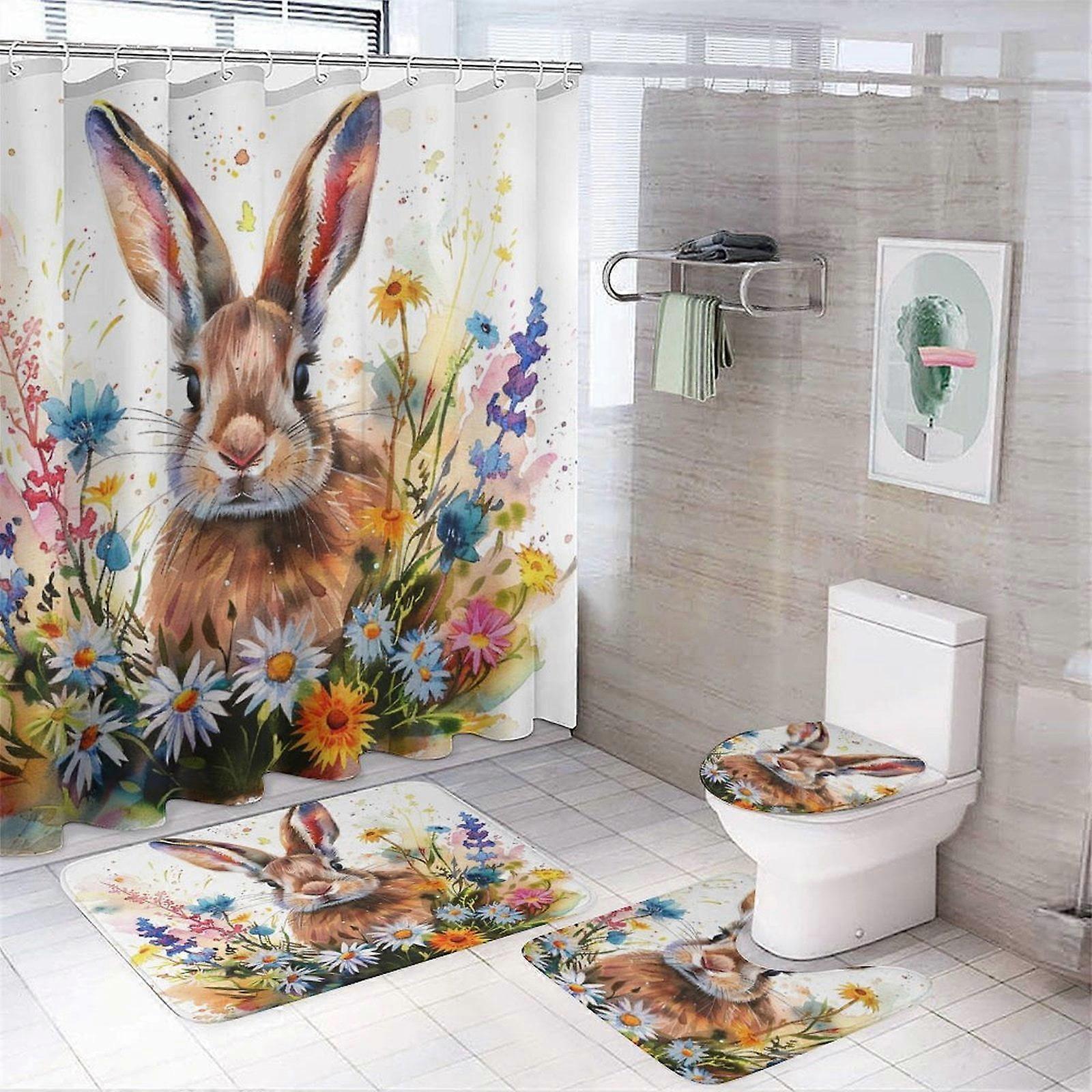 4-Piece Watercolor Rabbit Shower Curtain Set with Rugs – Farmhouse Easter Bathroom Decor, Compatible with Standard Showers