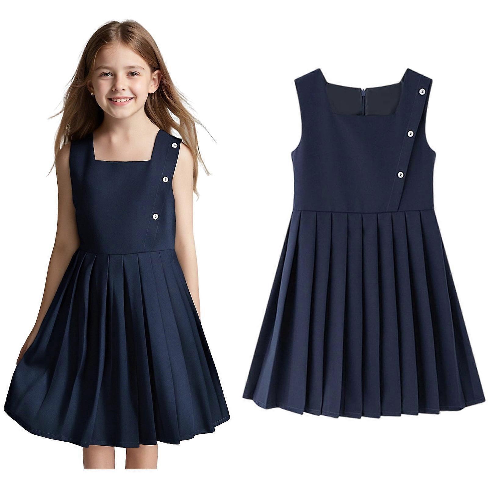 Girls Uniform Dress Cute Pleated Knee Length Sleeveless Navy Uniform Jumper Uniform Dresses for Girls 15-16 Years
