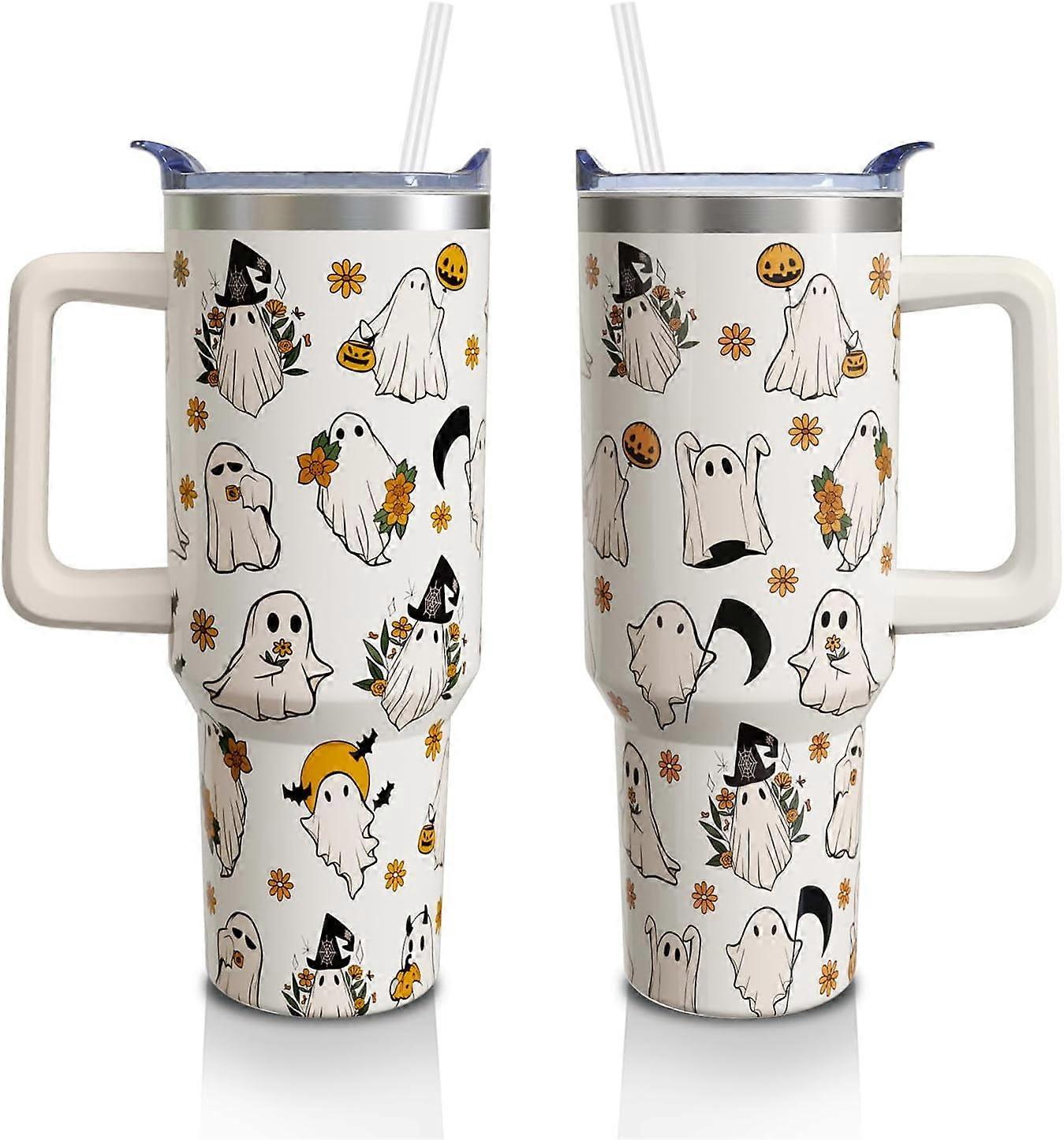 Halloween Ghost 40oz Tumbler with Handle & Straw – Spooky Flower Stainless Steel Vacuum Insulated Cup, Holiday Gift for Women & Men – Compatible