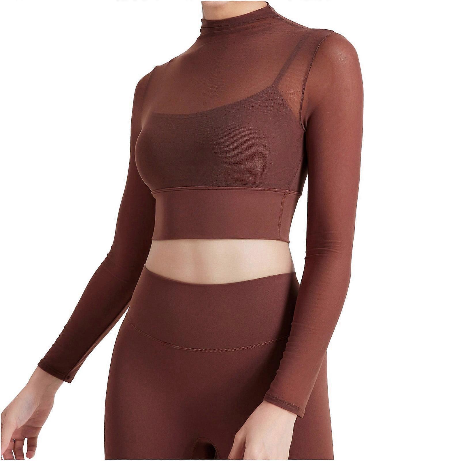 Womens Long Sleeve Crop Tops with Built in Bra Mesh Sports Bra Sheer Neck Padded Workout Cropped Yoga Shirts Coffee M
