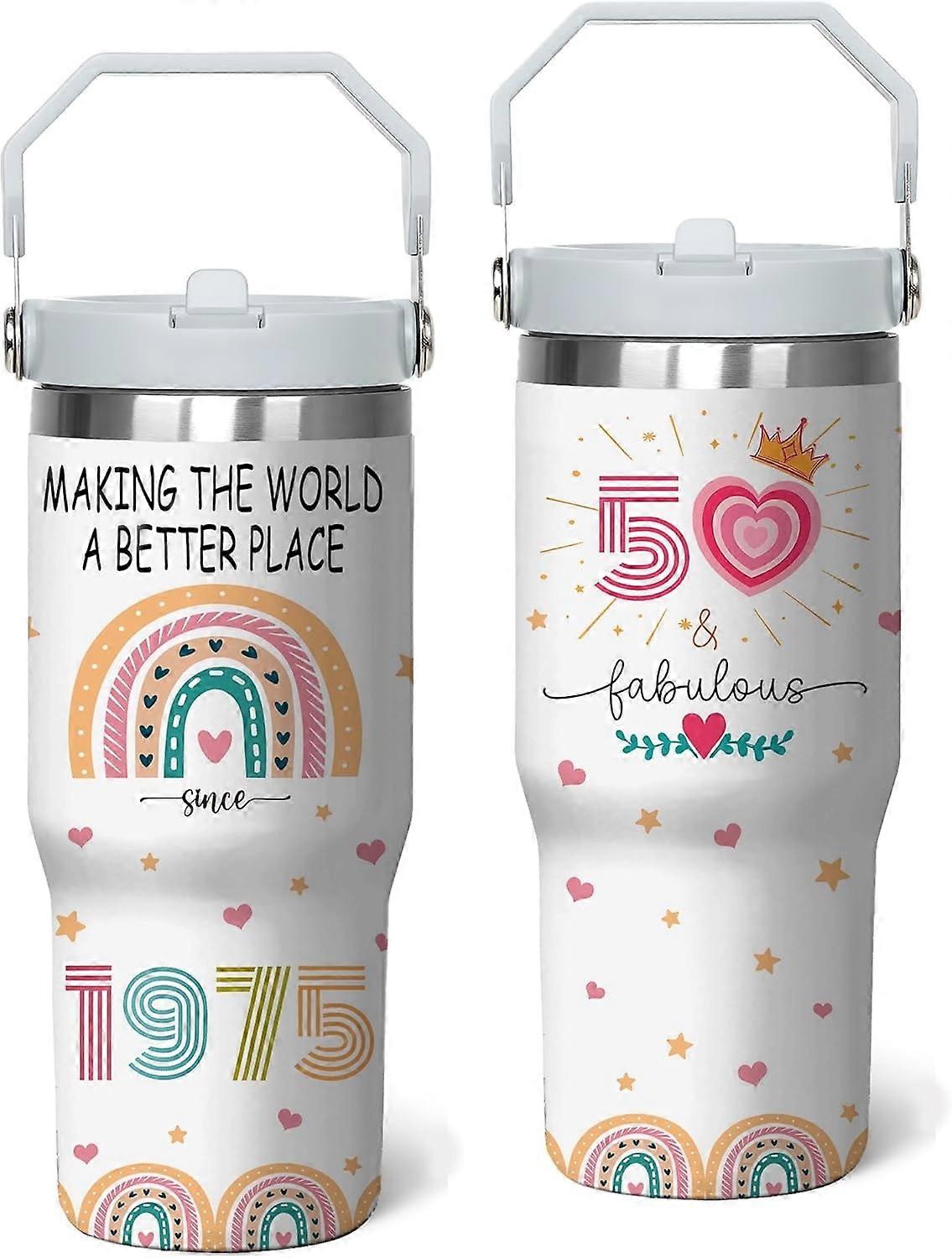 50th Birthday Tumbler 1975 – 40 oz Stainless Steel Cup with Handle & Straw, Compatible with Most Cup Holders