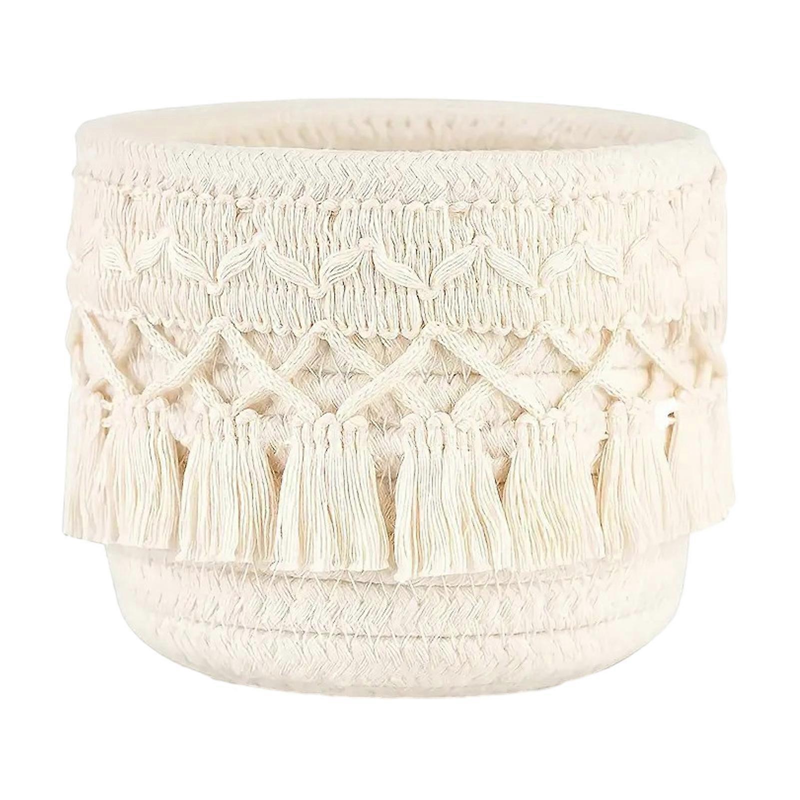 Boho Makeup Brush Holder Knotted Cord Tabletop Organizer with Tassels Handmade Circular Woven Basket for Office Desk Home Bedroom Dresser