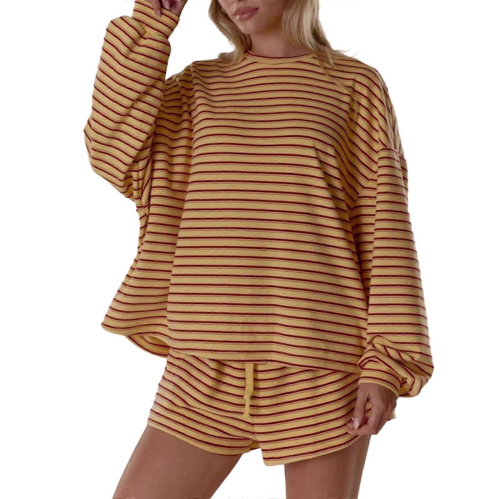 Women's Loose Fit Striped Long Sleeve Tshirt And Stretchy Shorts Comfortable 2 Piece Outfit Lounge Sets For Daily Wear street fashion matching set
