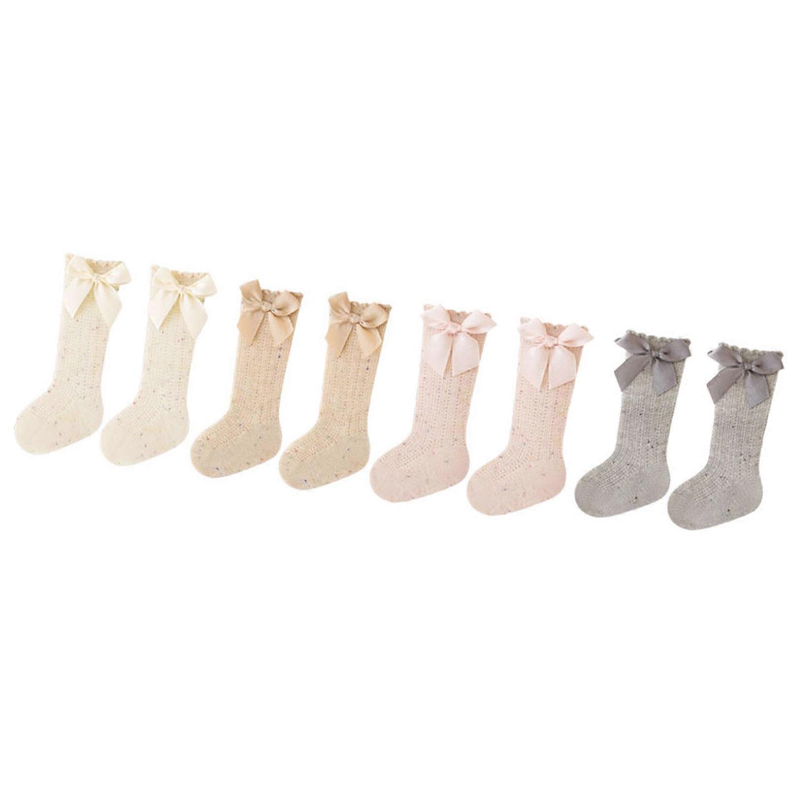 Features: Elegant Bowknot Design : Features large bow lace knee socks with detail, adding playfulness and charm to kids' outfits. The exquisite bows on each pair attract attention, making children stand out at parties or daily occasions. Breathable Cotton Fabric : Made from quality cotton for lasting comfort. Soft and breathable fabric reduces friction, keeping active kids dry all day during school or outdoor. Elastic Fit Technology : Designed with stretchable top which snugly stay in place without slipping. Solves common sock dropping issues, providing easy wear for children. Mixed Color : Easily pairs with dresses, shorts, or skirts to showcase unique personalities, perfect for fashion conscious families. Reinforced Durability : Strengthened toe and heel areas enhancing wear resistance for long lasting use. Maintain shape and color after multiple washes, offering practical value for busy parents. Specifications: Fabric: cotton Size: XS to L(mixed color) Size:XS Suggest Foot Length:8-10cm(3.15-3.94inch) Suggested Age:0-6 months Size:S Suggest Foot Length:10-12cm(3.94-4.72inch) Suggested Age:6-12 months Size:M Suggest Foot Length:12-14cm(4.72-5.51inch) Suggested Age:1-3 years Size:L Suggest Foot Length:14-16cm(5.51-6.30inch) Suggested Age:3-5 years Package Includes: 4 pair children's large bowknot lace knee socks note: Please allow 1-2cm errors due to manual measurement. Due to the difference between different monitors, the picture may not reflect the actual color of the item.