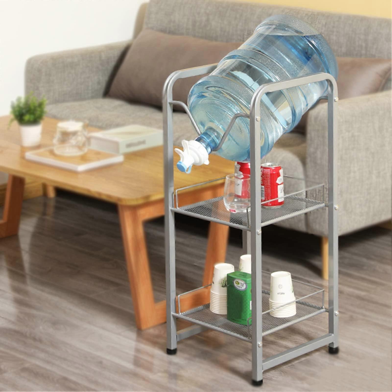 Save floor space and keep water jugs organized with this 2 tier steel water cooler jug rack. Designed to hold heavy 3 gallon or 5 gallon bottles, the rack keeps bottles off the floor, provides easy access, and maintains a neat, uncluttered area. Key benefits Maximizes floor space by stacking two water jugs vertically. Easy access and quick bottle changes without bending or moving multiple jugs. Durable steel construction supports heavy loads without collapsing. Protects floors with rubber feet that prevent sliding and scratching. Features and performance Material and finish: steel with an electroplated surface that resists moisture, dust, and rust. Capacity: Supports standard 3 gallon and 5 gallon water jugs. Valve included: 1 valve provided that fits 5.5 cm (2.125 in) crown bottles; not compatible with screw bottles. Feet: Four rubber floor protectors included for stability and floor protection. Assembly: Simple, tool assembly. Components can be detached for relocation or storage. Color: Silver Dimensions and compatibility Overall dimension: 33 cm x 33 cm x 78 cm (13 in x 13 in x 30.75 in). Valve fitting: 5.5 cm (2.125 in) crown water bottles only. Do not use with bottles that have screw tops. Package contents 1 x Water cooler jug holder 1 x Valve Suggested use scenarios Office break room: Stack refill bottles to save floor space and keep the break area tidy. Home kitchen or pantry: Store extra 3 gallon or 5 gallon water jugs off the floor and within easy reach. Workshop or small warehouse: Organize bulk water supplies where space is limited and accessibility matters. Notes Allow slight measurement deviation due to manual measurement. Actual color may vary slightly from images because of monitor and lighting differences. For any concerns, customer support is available and will reply within 24 hours.