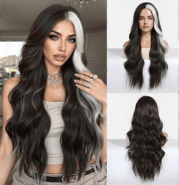 28" Long Curly Wig, Natural Fluffy Big Wave, Soft High-Temp Silk, Black & White, Cosplay-Ready, Compatible with Daily Wear