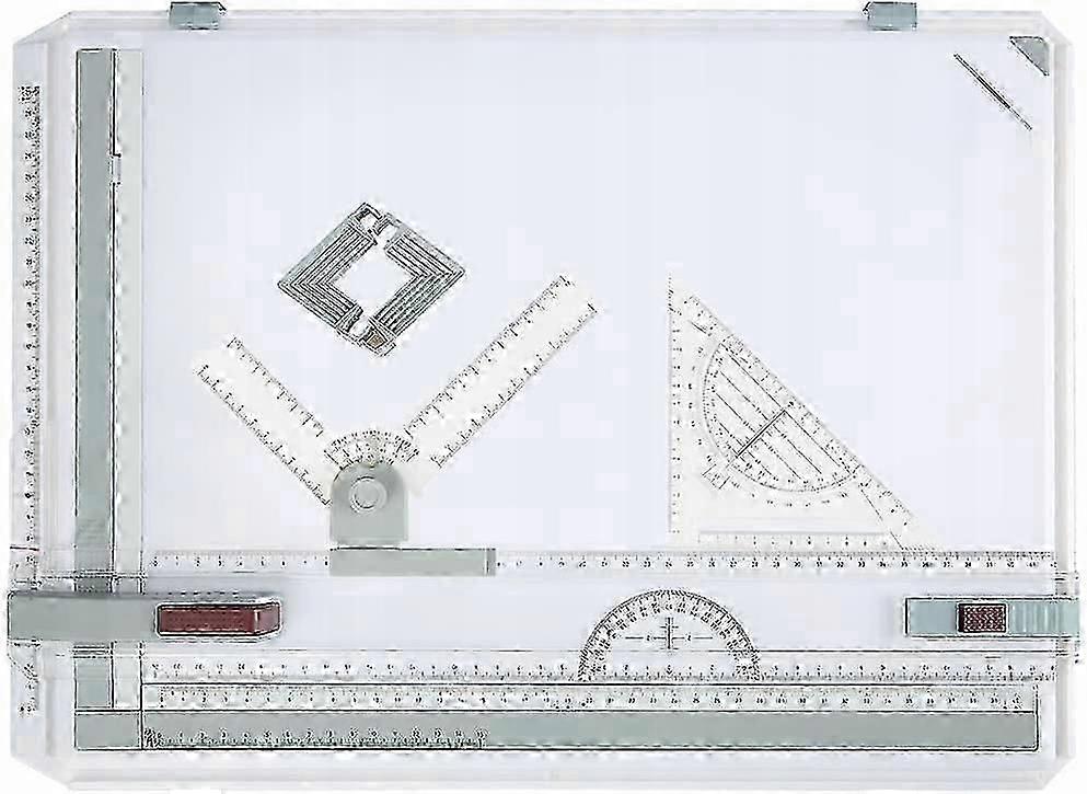 Complete A3 drafting workstation with parallel movement that locks at each end. Includes transparent sliding ruler (in centimeters), long guide, quick-release paper claw, 45-degree triangle, and 2 non-slip support legs. Features a 180-degree protractor, magnetic clips, and corner clamp for precision and secure grip. Ergonomic design for comfortable use, ideal for engineers, architects, and designers. Material: Made of plastic. Note: This drawing board is a useful tool for technical drawing and makes a convenient gift.