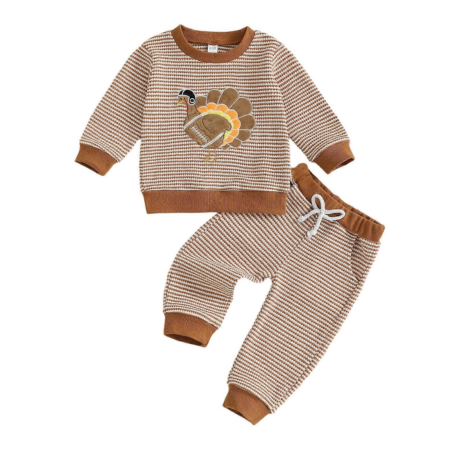 Thanksgiving Girls Outfits 2 Piece Turkey Embroidery Knit Sweatshirt And Striped Pants Toddler Fall Winter Soft Kids Wear
