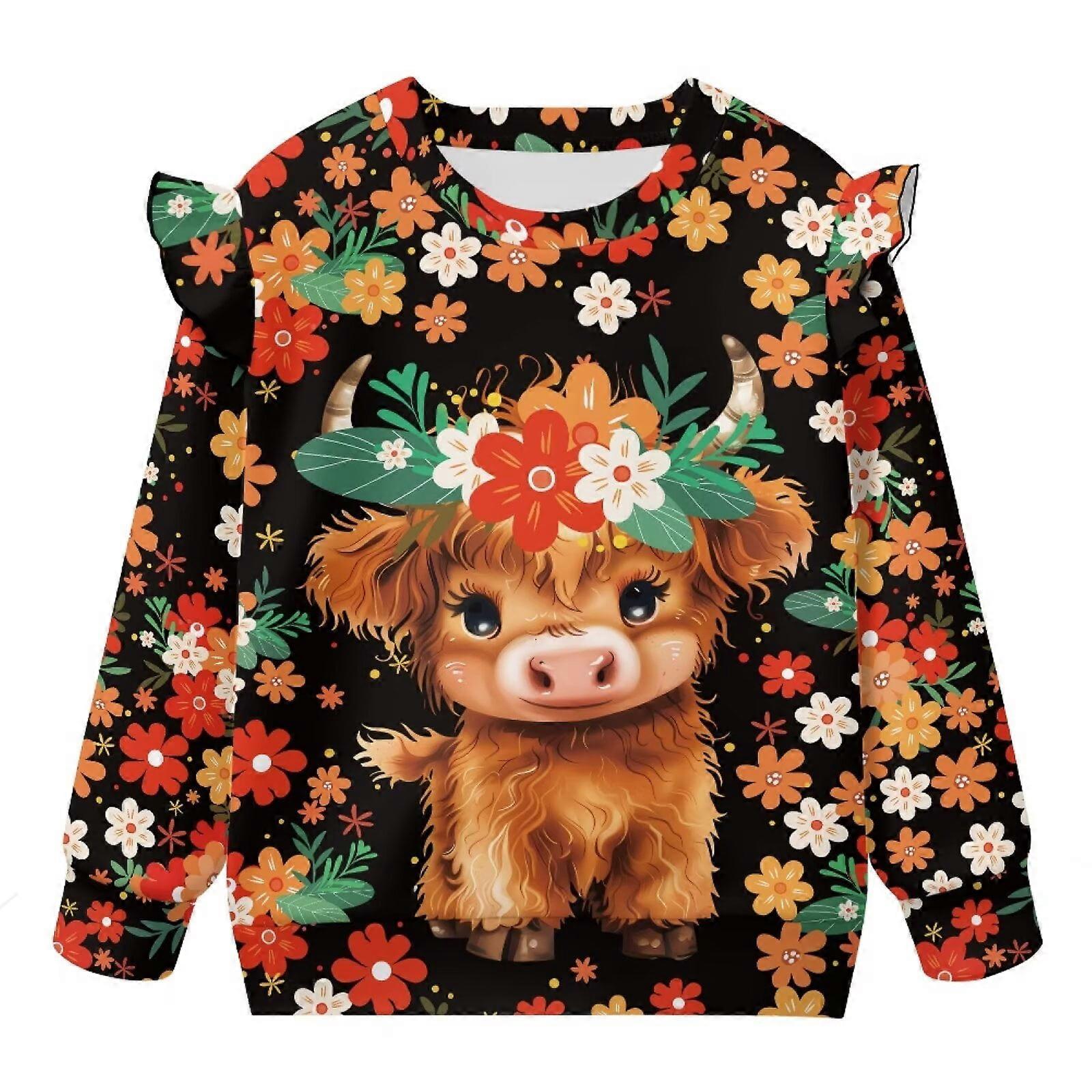 Cute Highland Cow Floral Pullover Sweatshirt for Girls, Long Sleeve Crewneck, Fall Trendy Athletic Sweater, Size 5-6