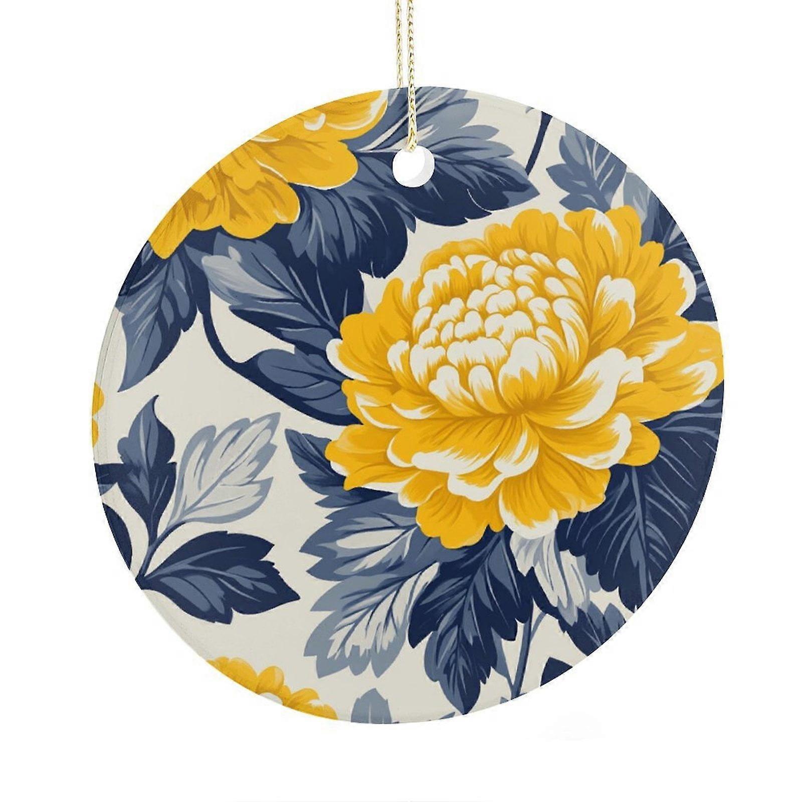 Navy & Yellow Dahlia Flower Ceramic Christmas Ornament, 3", Custom 2025 Xmas Tree Decoration
