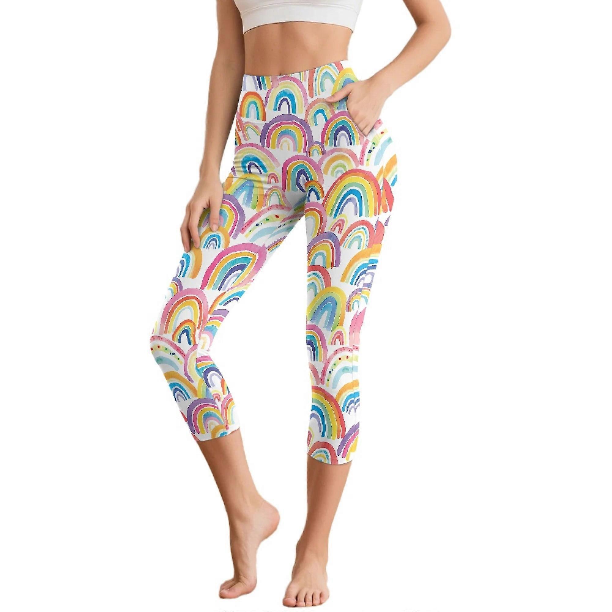 Rainbow Printed Capri Leggings for Women Tummy Control Yoga Pants Athletic Workout Leggings with Pockets, 2XL