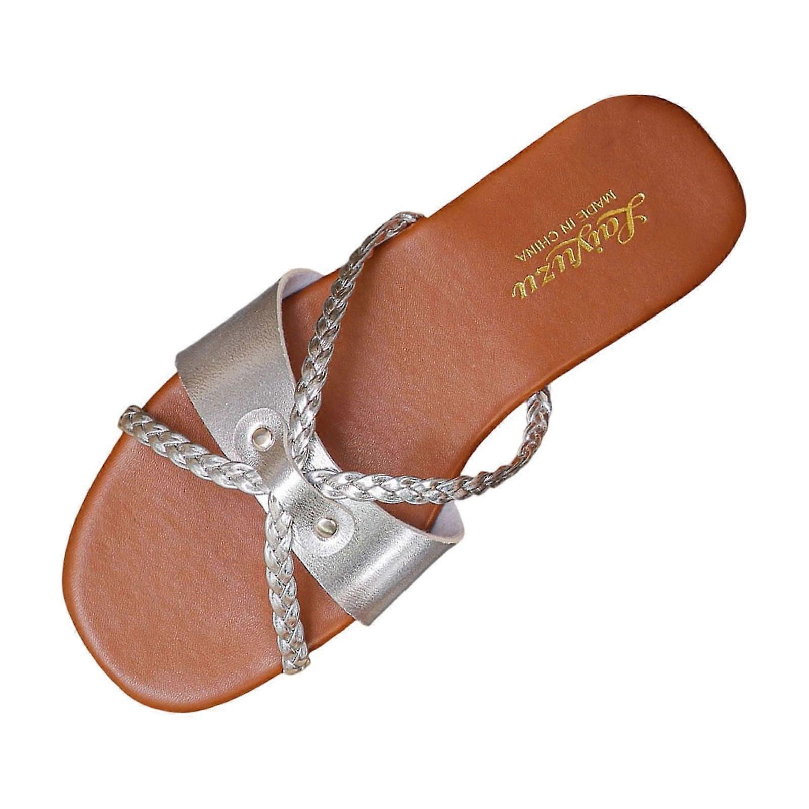 Women's Silver Flat Strappy Sandals, 1cm Heel, Synthetic, Beach & Summer Wear, Size 40, Compatible with Casual Outdoor Use