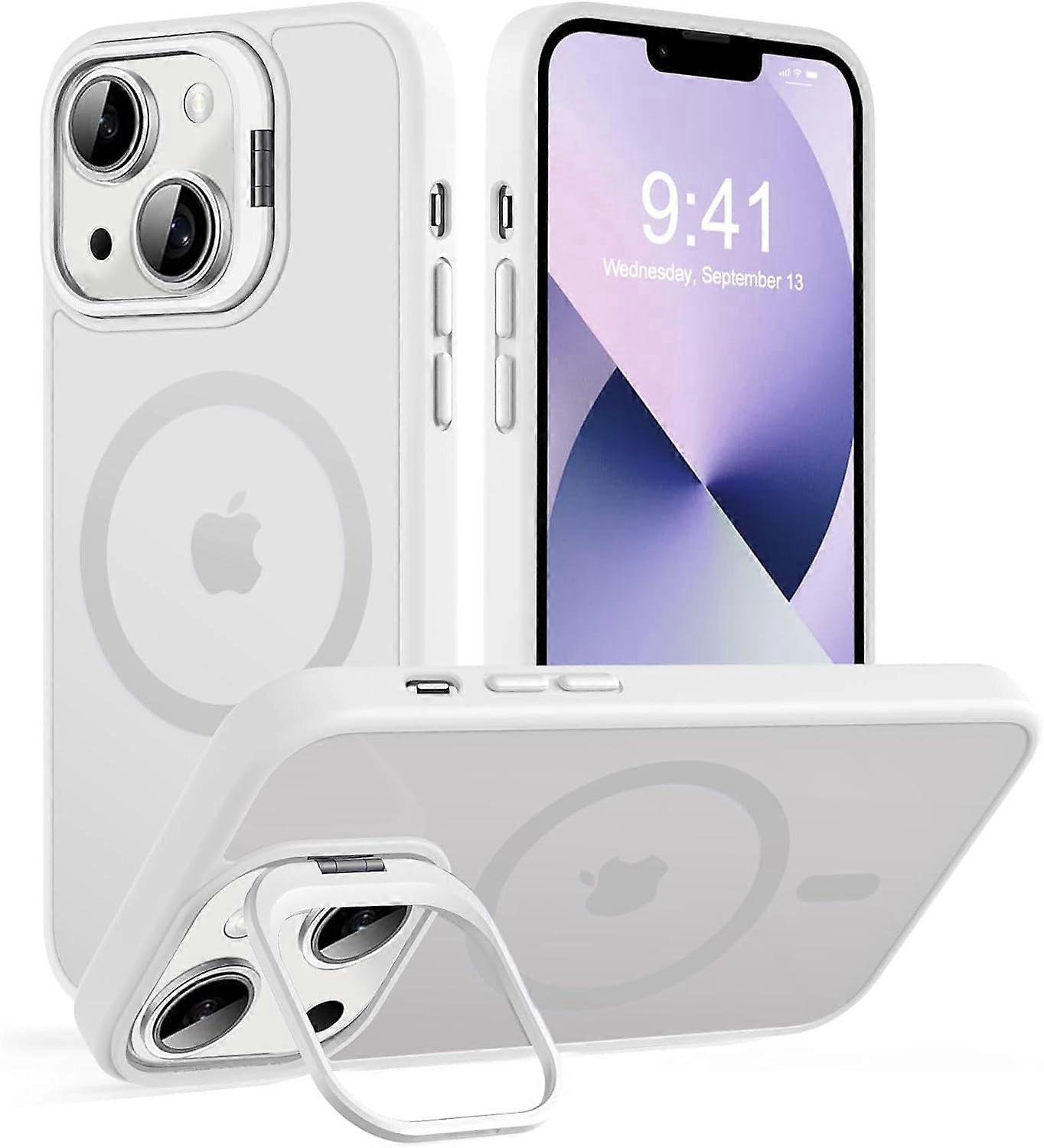 Magnetic iPhone 13/14 Case, MagSafe Compatible, Built-in Stand, Matte Scratch-Resistant & Shockproof, Frosted White