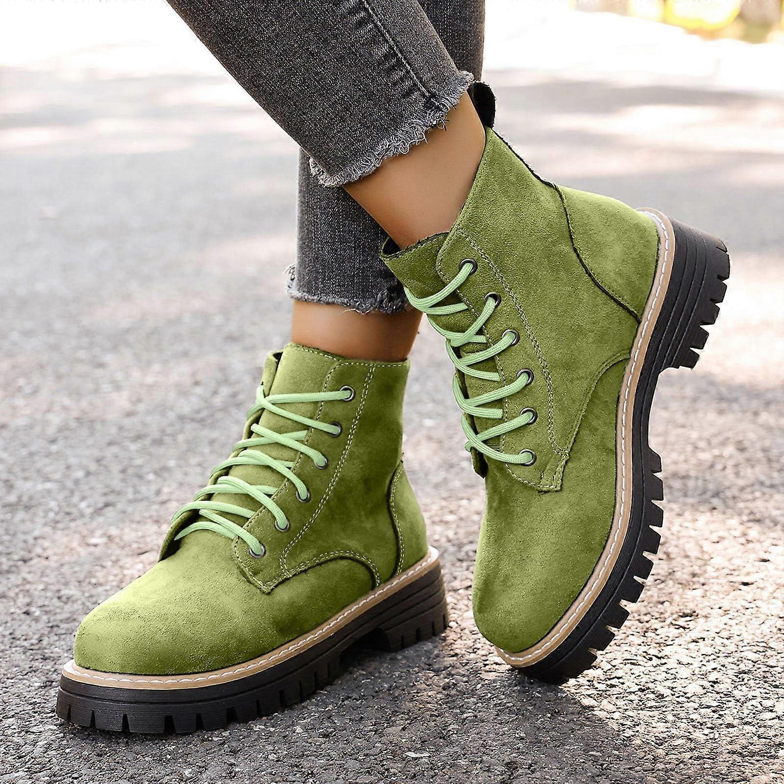 Women's Fluorescent Green Ankle Boots, Chunky Lace-up Combat Style, Low Heel, Platform Lug Sole, Non-Slip, Round Toe, Side Zipper – Compatible with