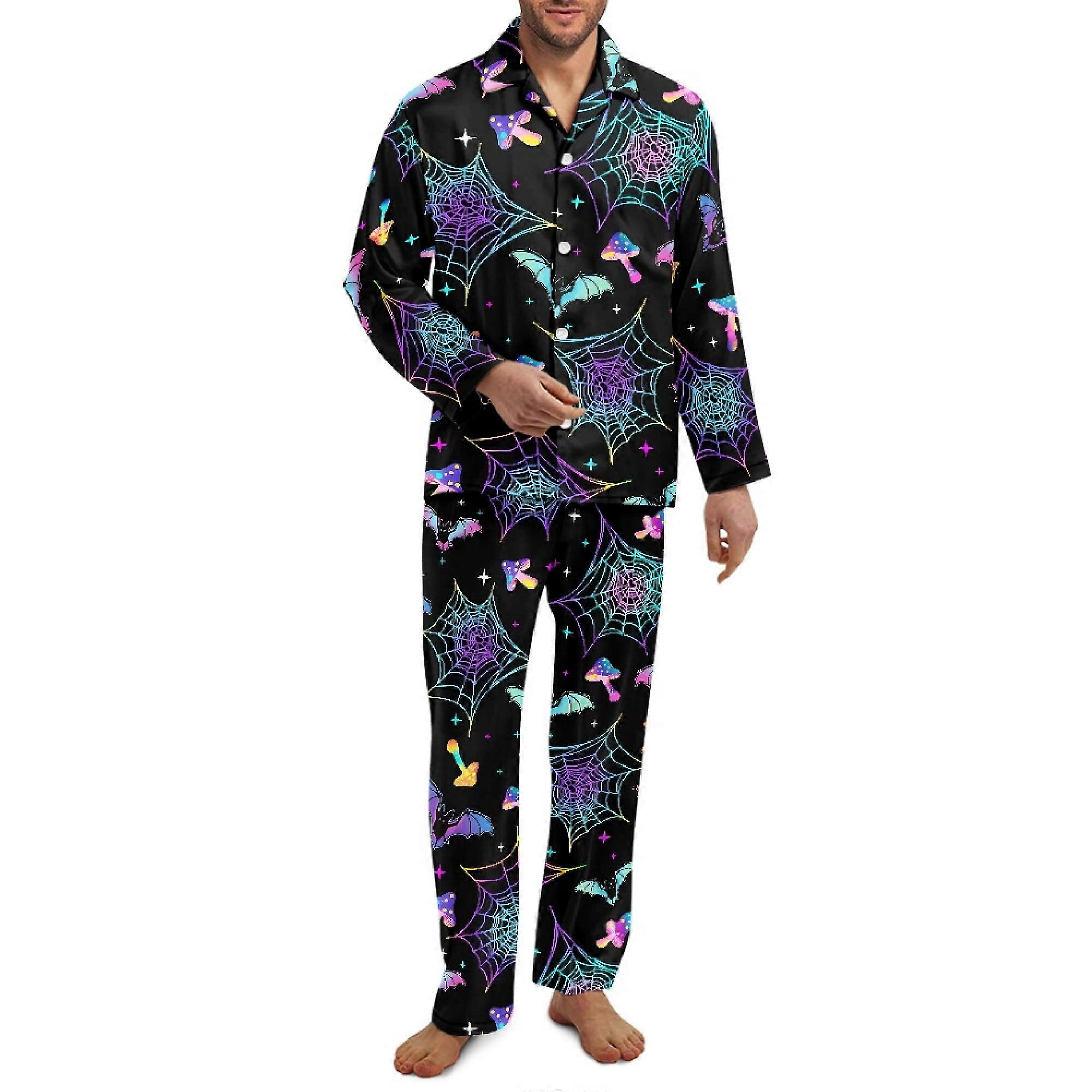 Rainbow Pineapple Button-Up Pajama Set, XL, Men’s 2-Piece Long Sleeve Sleepwear with Pockets