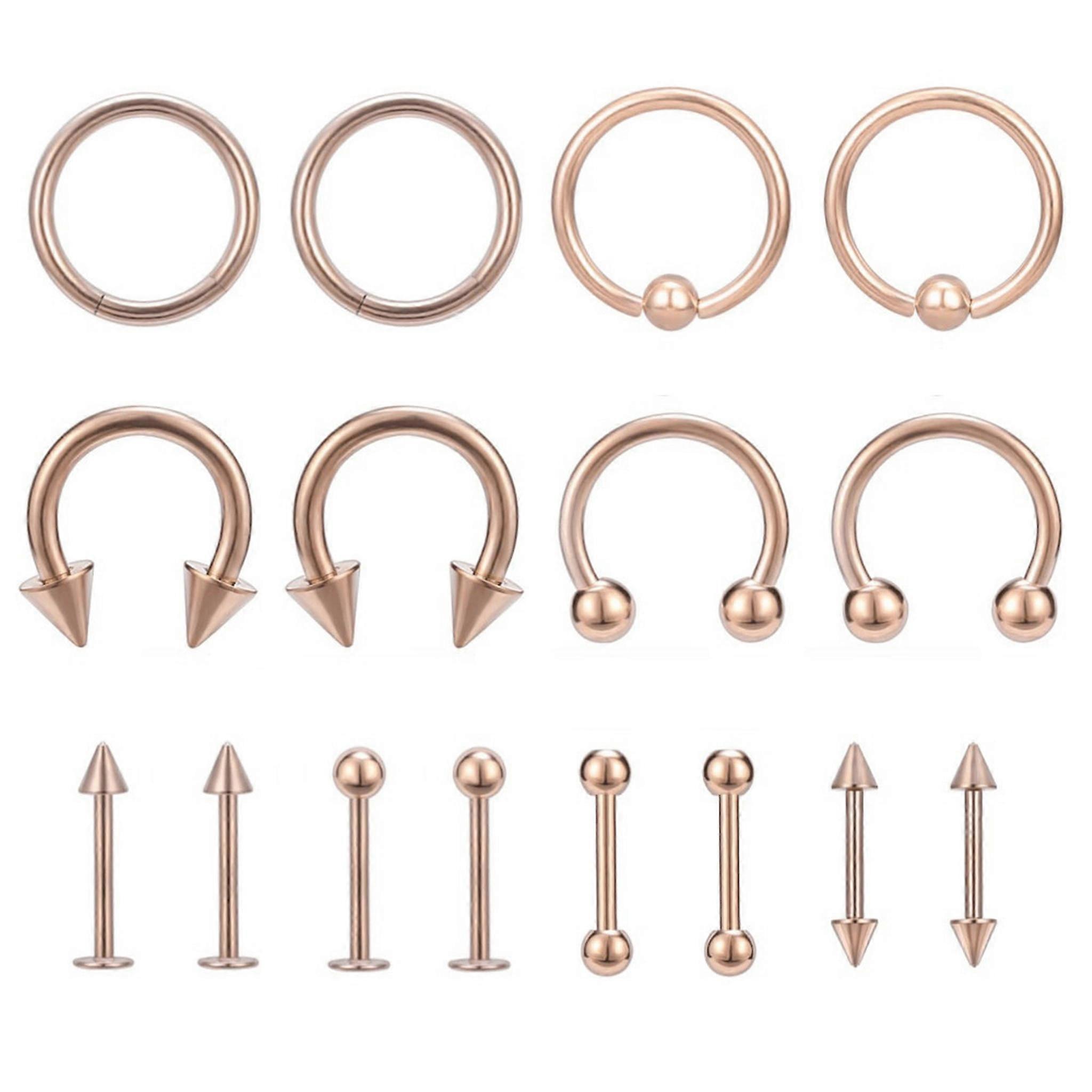 16 Pcs/lot Stainless Steel Nose Rings 14/16G Ear Labret Tongue Eyebrow Piercings-Rose gold-8mm