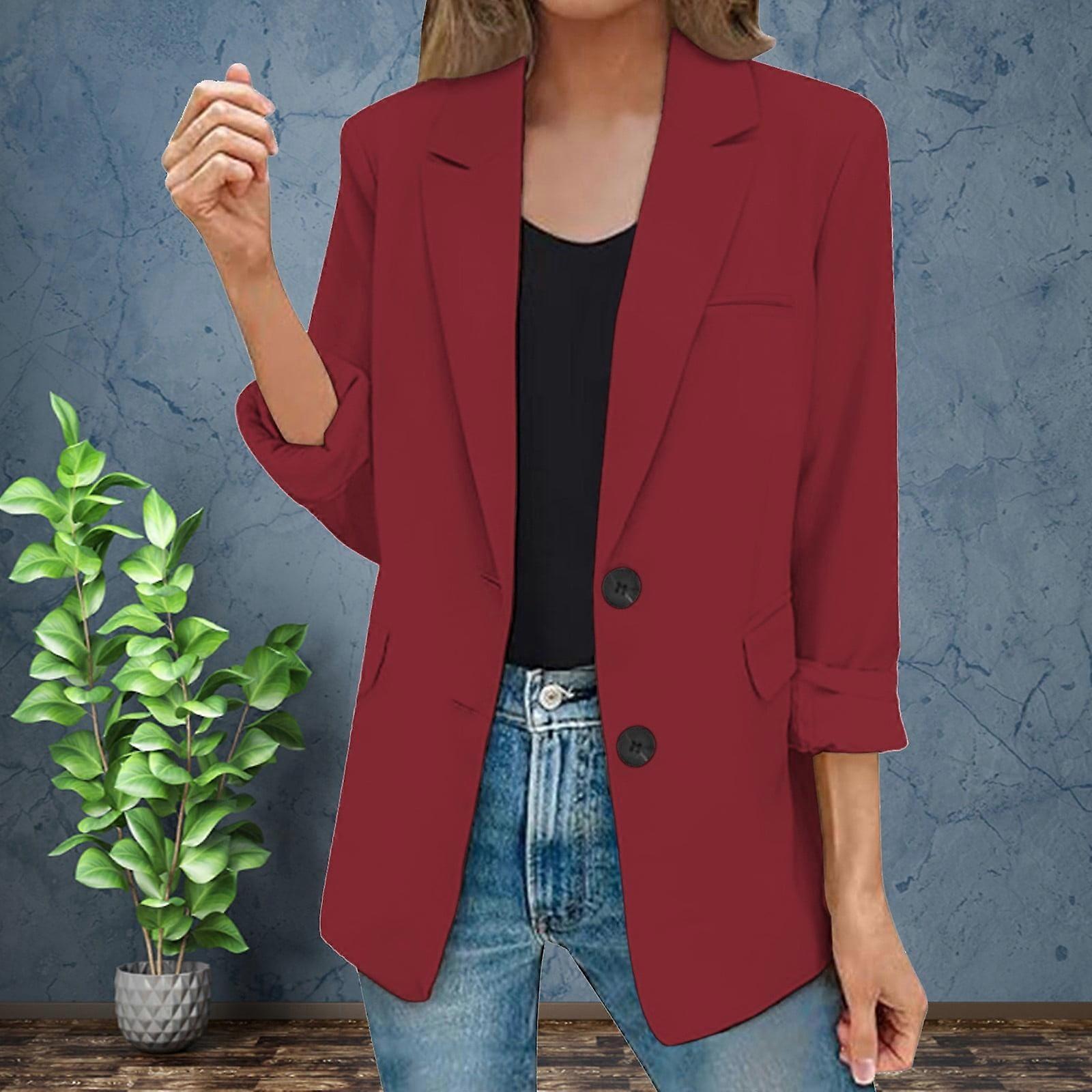 Women's Fitted Red Blazer Jacket, Casual or Office Wear, Open Front with Pockets, Long Sleeve, Lapel & Buttons – Compatible with Work Suits