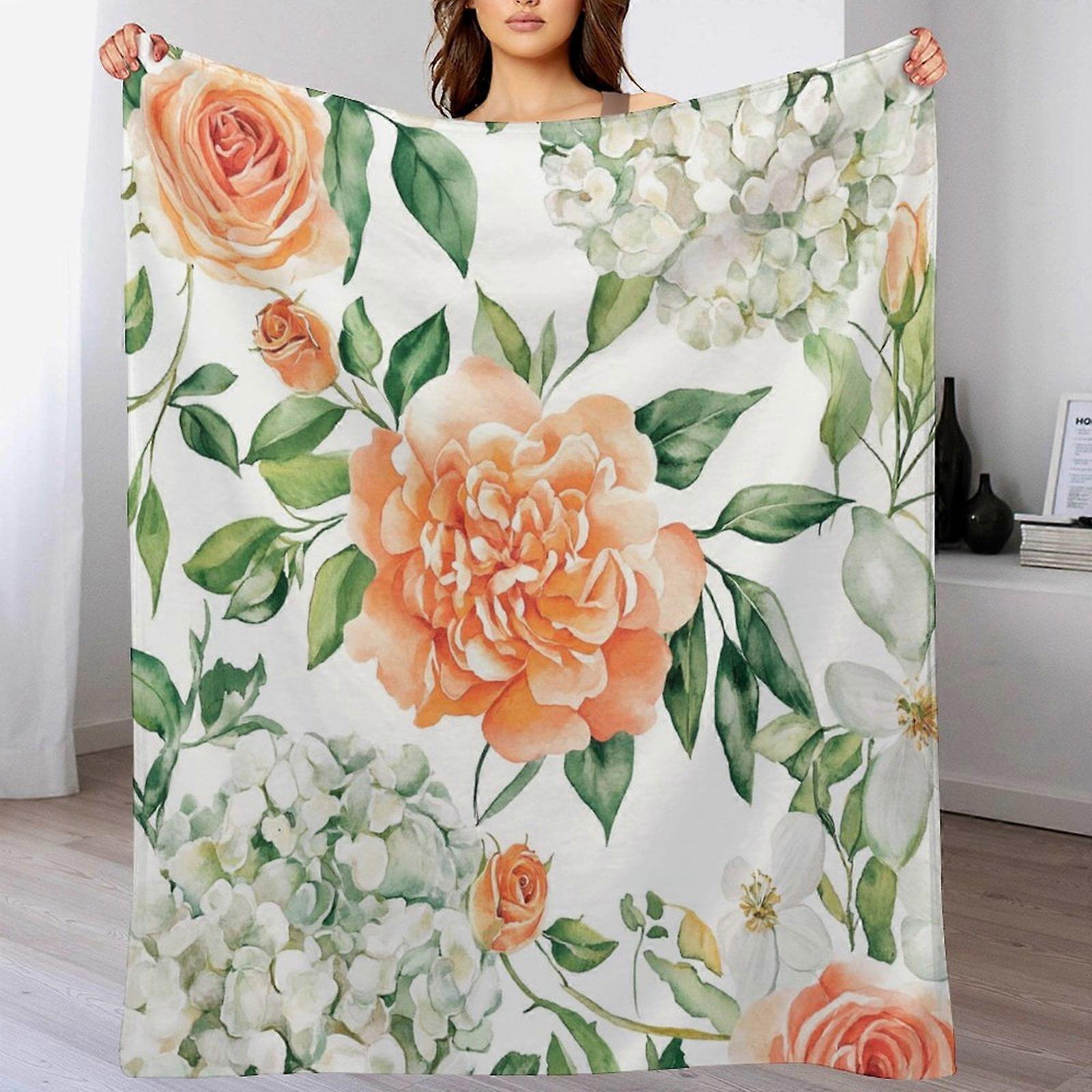 Peach & Green Watercolor Floral Flannel Blanket 60"x80" – Spring/Summer Farmhouse Fleece Throw for Couch, Bed, Adults & Kids
