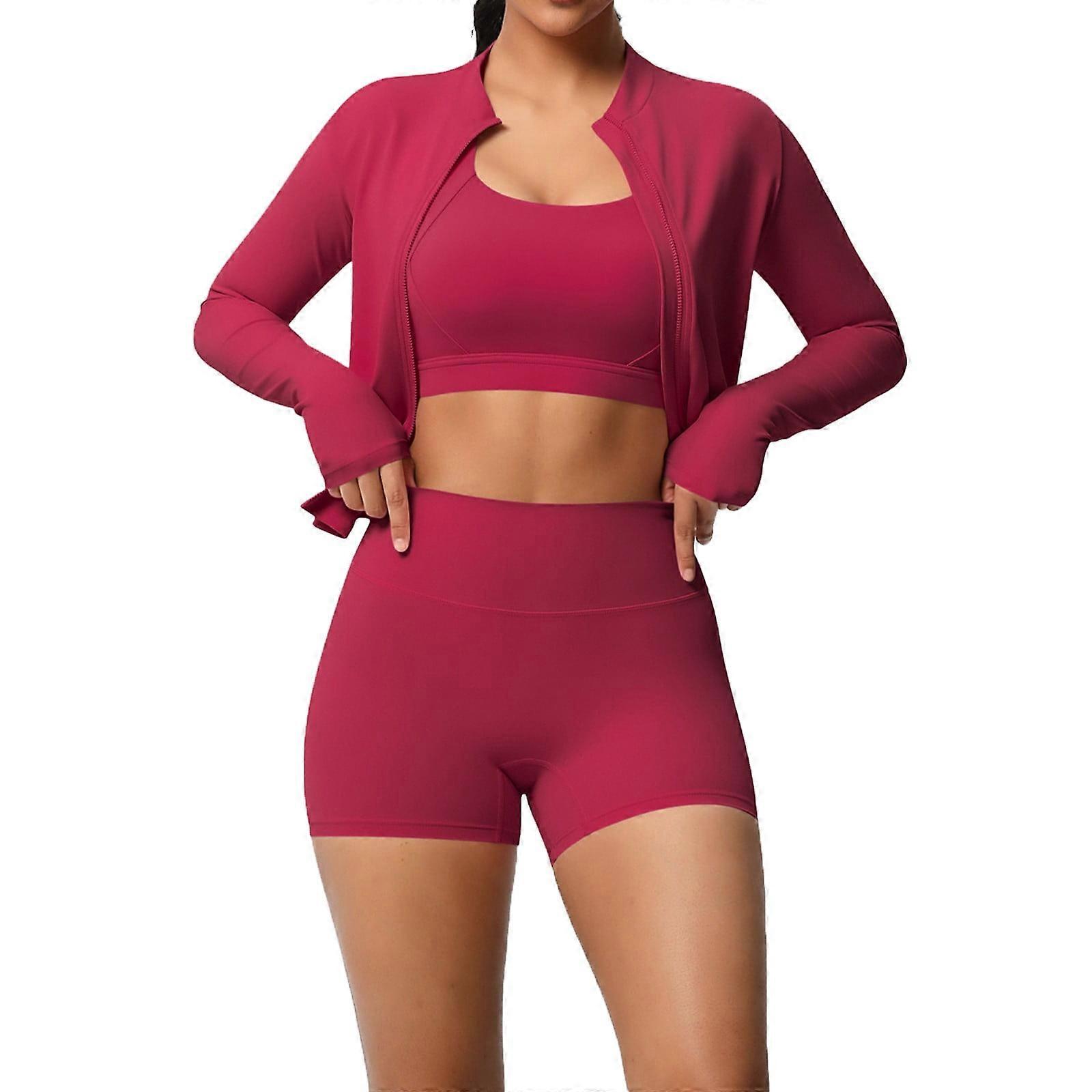 Womens Workout Sets 3 Piece Seamless Long Sleeve Jacket and Short Scrunch Leggings Racerback Sports Bra Yoga Gym Outfits Red XL