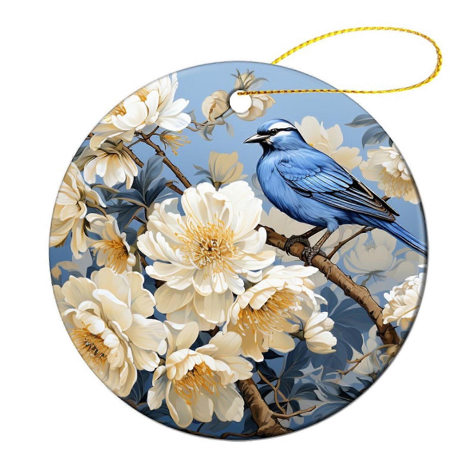 Classical Chinese Double-Sided Ceramic Ornament, Chinoiserie Blue Floral & Birds Design, Elegant Hanging Christmas Tree Decor, Compatible with All