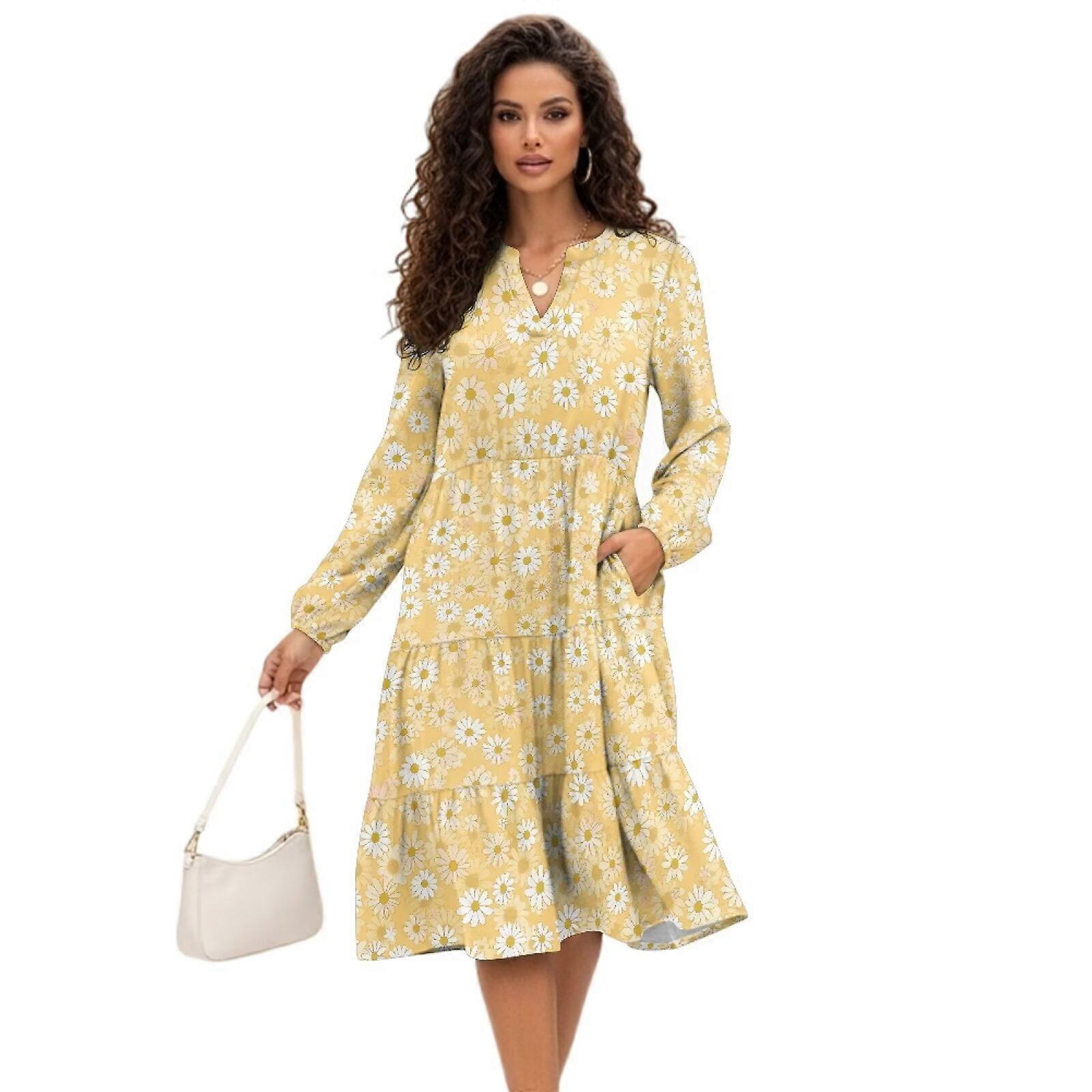 Women midi dress with soft fabric, offering a cozy and pleasant wearing experience.Women’s midi dress features print design, adding a charming touch and creating a attractive look. Womens midi dress with ruffled tiered details offers a chic and trendy style, adding a touch of femininity and charm to your outfit Enjoy the convenience of hidden side-seam pockets that blend seamlessly with the dress design. These functional pockets are perfect for carrying small essentials while maintaining the elegant appearance of the dress This elegant midi dress is a gift for your mom, wife, daughter, sister, and other girlfriends on Christmas, New Year, Valentine's Day, Brithday, Mother's Day, Honeymoon Vocation or other Festival This midi casual dress also can be a gift for friends, families, colleagues, Mother's Day, Valentine's Day, Wedding anniversary, Graduation ceremony, Christmas, Halloween, Thanksgiving Day, Christmas Day or anyone you care about Hand wash, do not bleach. Fit from S to 2XL 【Materials】This midi dress is made of polyester and spandex. This long sleeve dress features a V neck, stretchy fabric, two pockets, high waist, and a flowy tiered midi length 【Features】 This midi dress features a patchwork design, available in long sleeve options.Crafted from a soft fabric, this midi dress is cozy and lightweight for comfortable wear 【MATCH】This midi casual dress is ideal for spring and autumn, when you can pair it with sunglasses, sandals, and jewelry. In winter, pair it with a denim jacket or casual coat, belt, sneakers, boots, etc., to make it a fashionable and practical item 【OCCASIONS】Women's midi dress is suitable for everyday wear, shopping, dates, parties, family gatherings, the office, vacations, beach walks, and other occasions. It is also suitable for wedding guest 【Ideal Gift】 This midi dress is a gift for your mom, wife, daughter, sister, and other girlfriends on Christmas, New Year, Valentine's Day, Brithday, Mother's Day, Honeymoon Vocation or other Festival