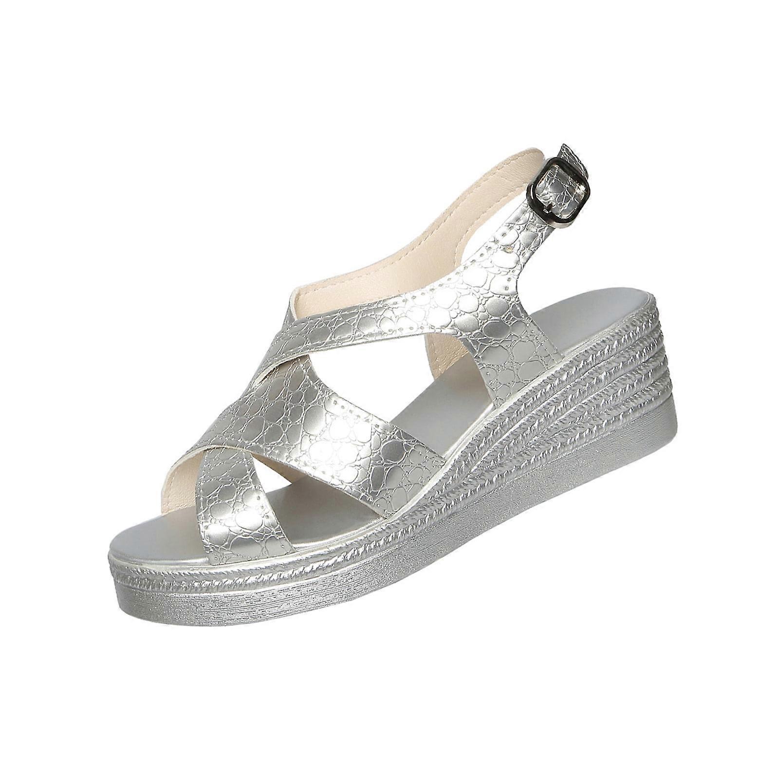 Silver Women's Wedge Sandals, Peep Toe, PU, Plus Size 39 – Comfortable Indoor/Outdoor Spring/Summer Footwear, Compatible with Beach & Casual Wear