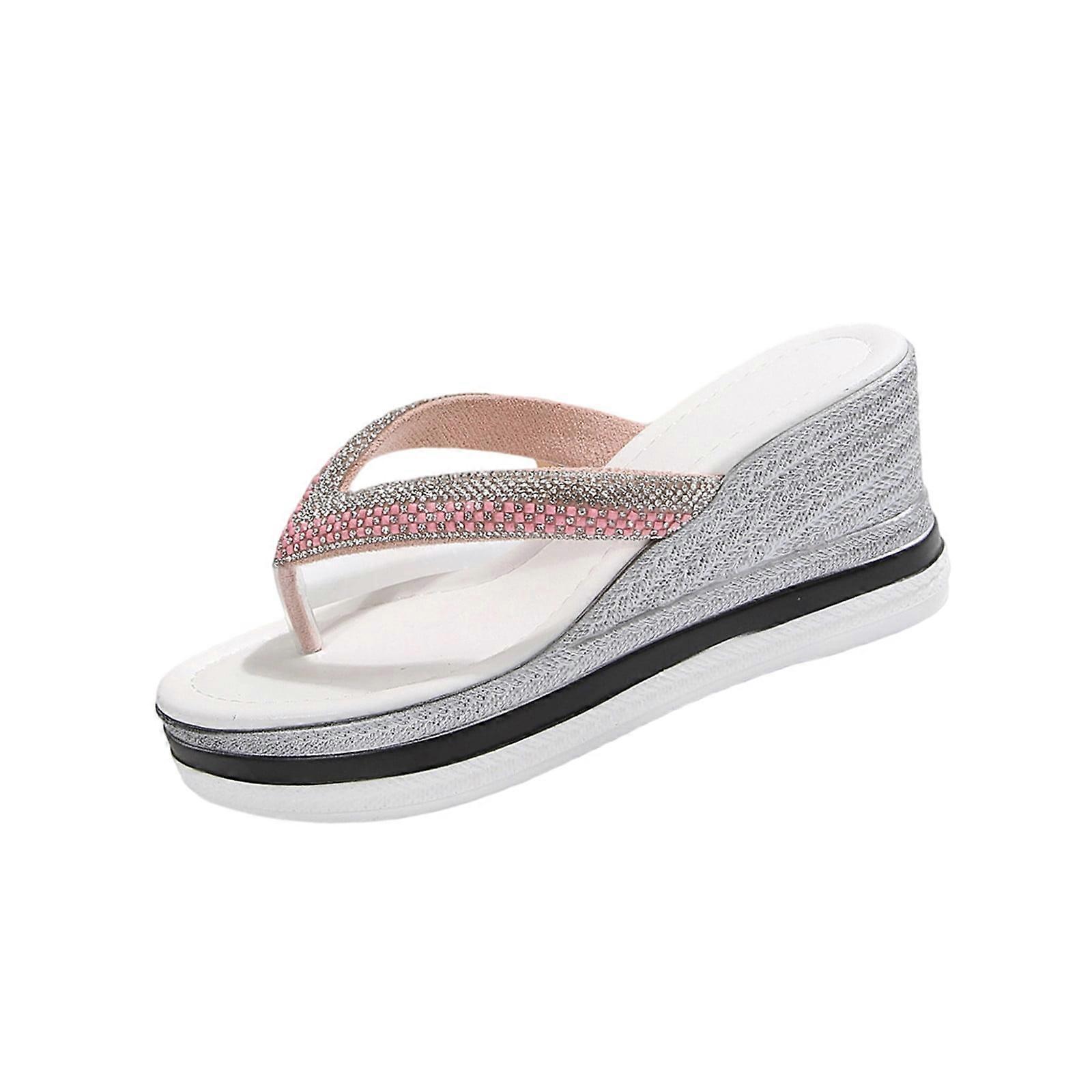 Pink Women's Wedge Sandals with Rhinestones, Open-Toe, Platform Heel, Thong Strap – Compatible with EU 43/US 9.5