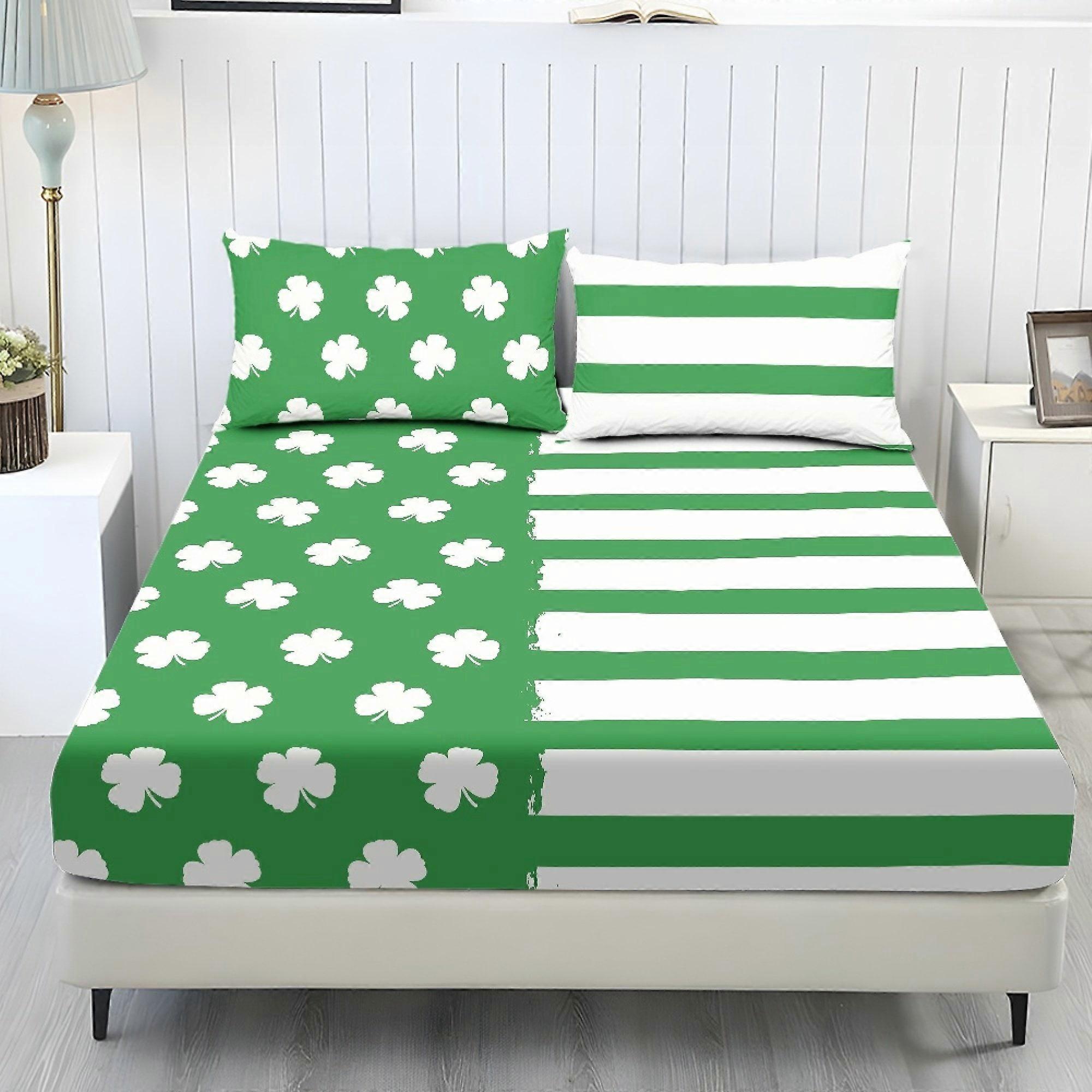 Twin Fitted Sheet Set w/ 2 Pillowcases – Soft Stretchy Shamrock Stripe Green/White Bedding, Elastic Edge, Compatible with Twin Beds