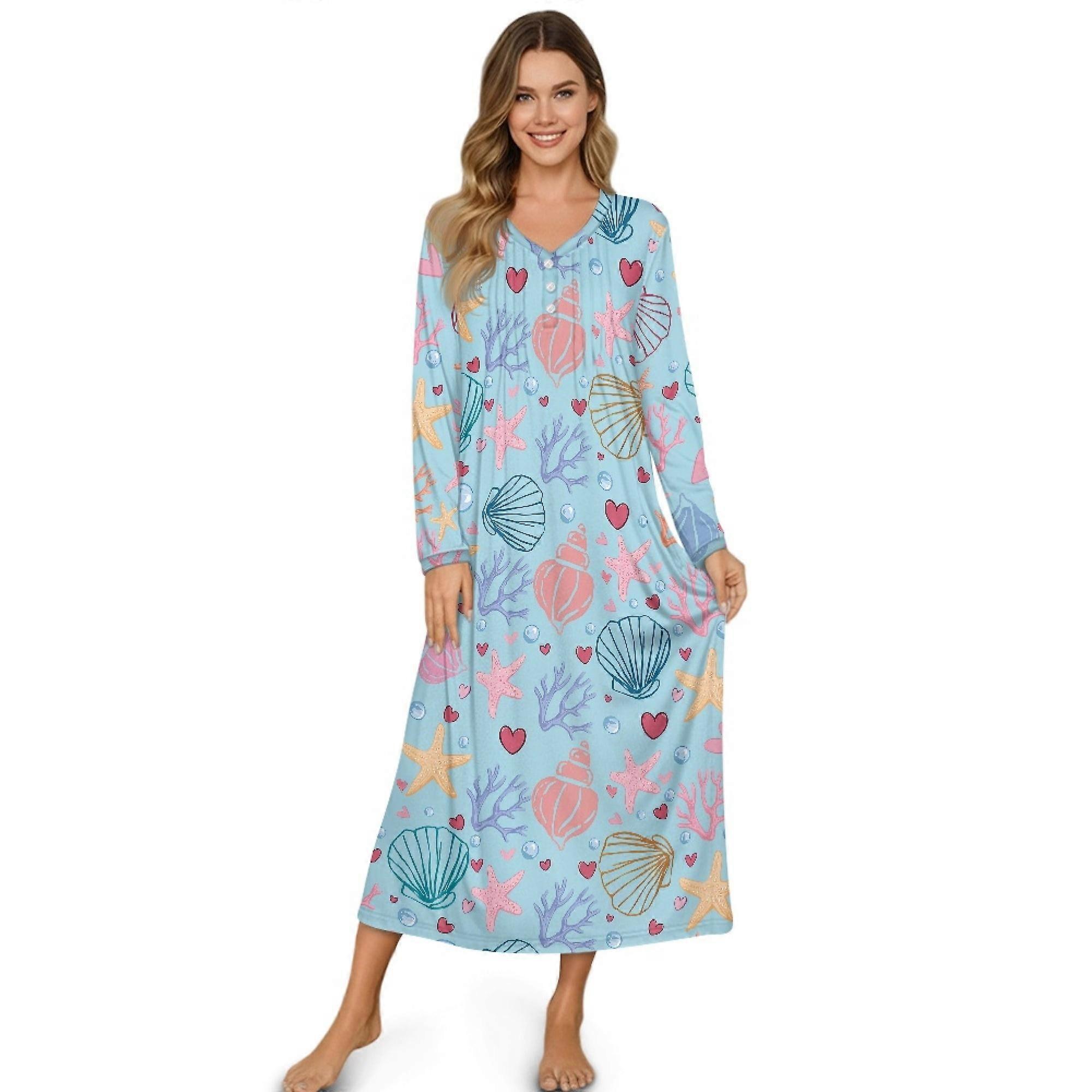 Women's Soft Cozy Housecoat Sleepshirt, Button-Front, Long Sleeve, Starfish Sea Shell Coral Blue, XL, Loungewear