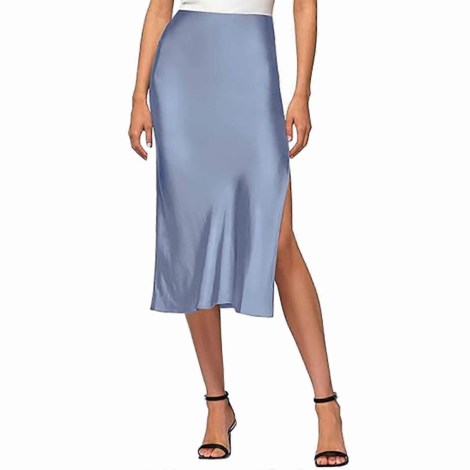 Women's Light Blue Satin Silk High Waist Slit Midi Skirt with Elastic Waistband
