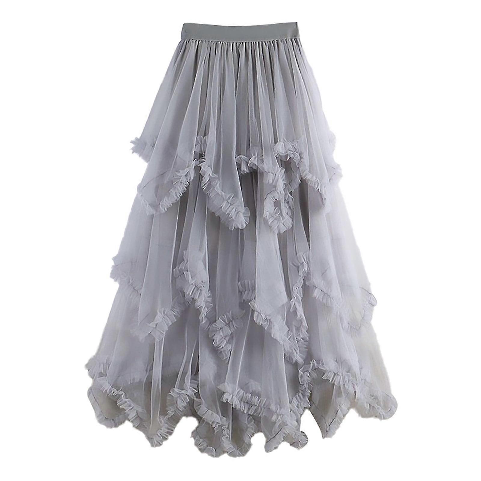 Women's Tulle Skirt Ruffle Multilayer Mesh A Line Tier Tutu Prom Wedding Long Tulle Skirts (Gray,One Size)